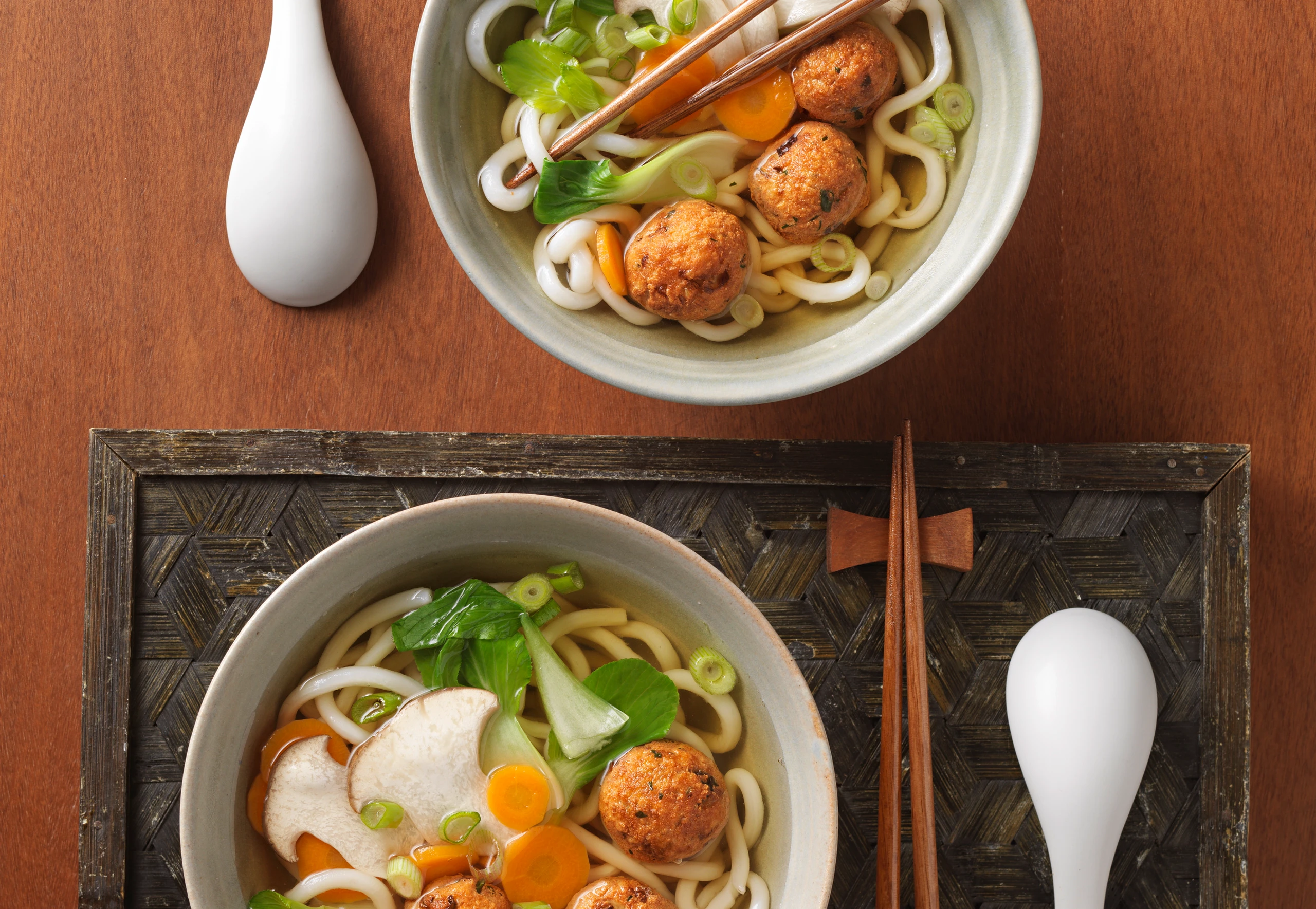 Nudeln und Tofu-Bällchen in großen Schüsseln anrichten, kochend heiße Gemüsesuppe darauf geben, mit Jungzwiebeln bestreuen.