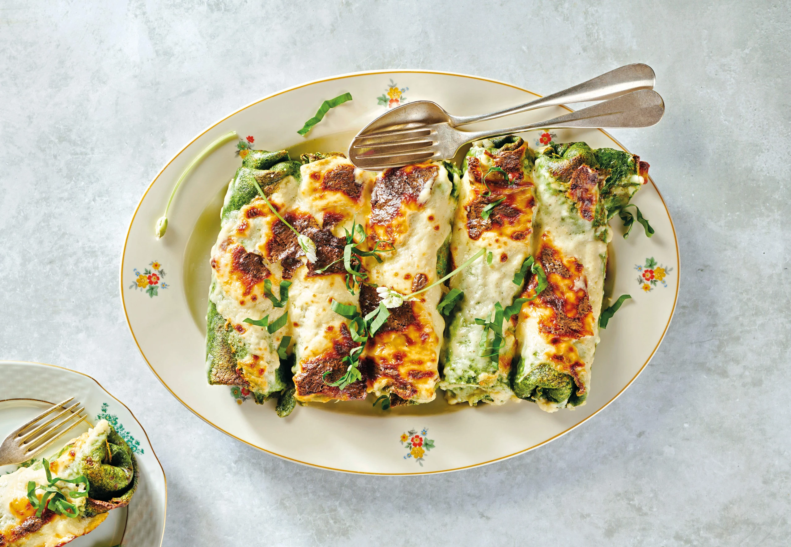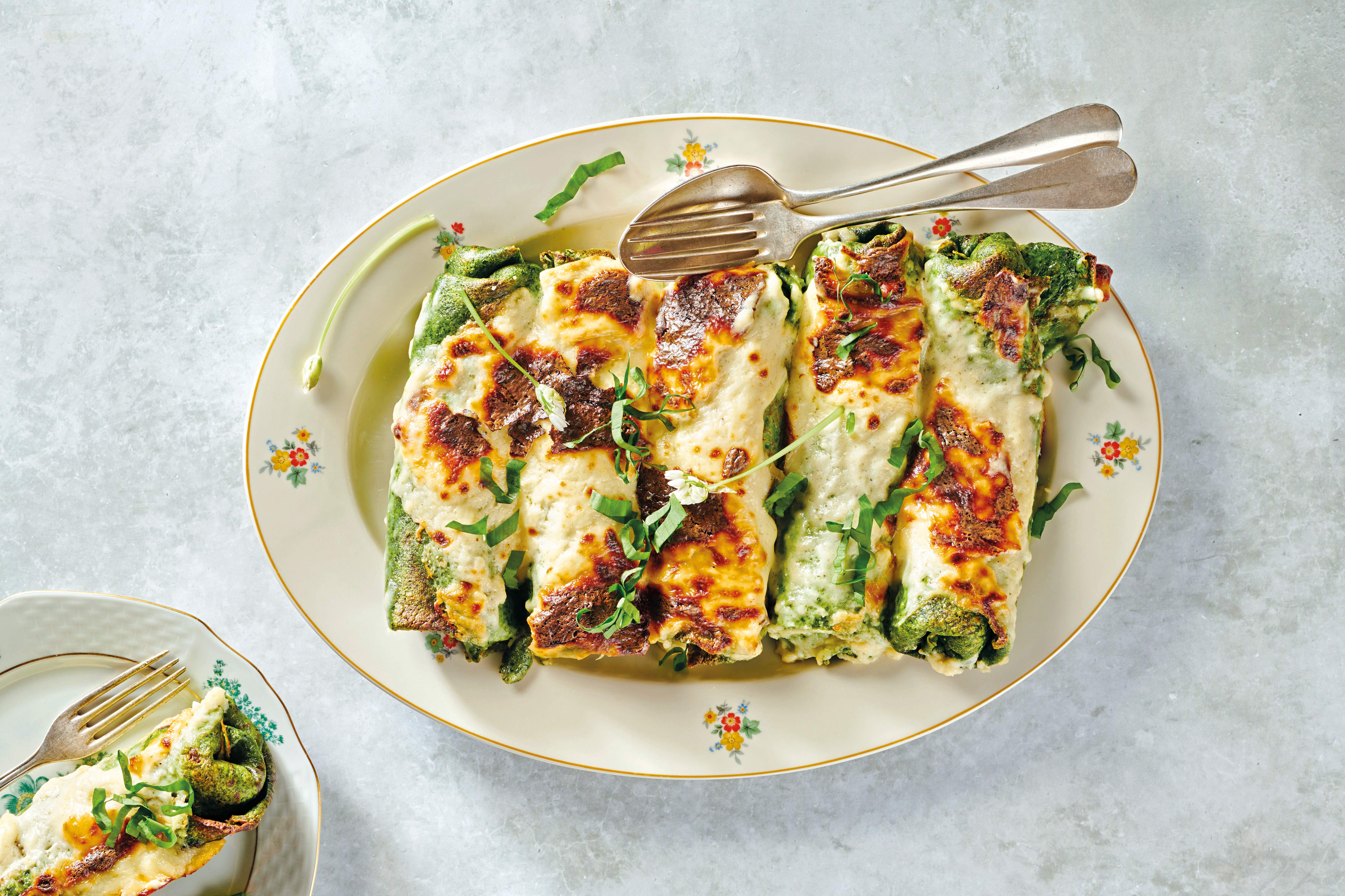 Überbackene Bärlauch-Palatschinken mit Faschiertem