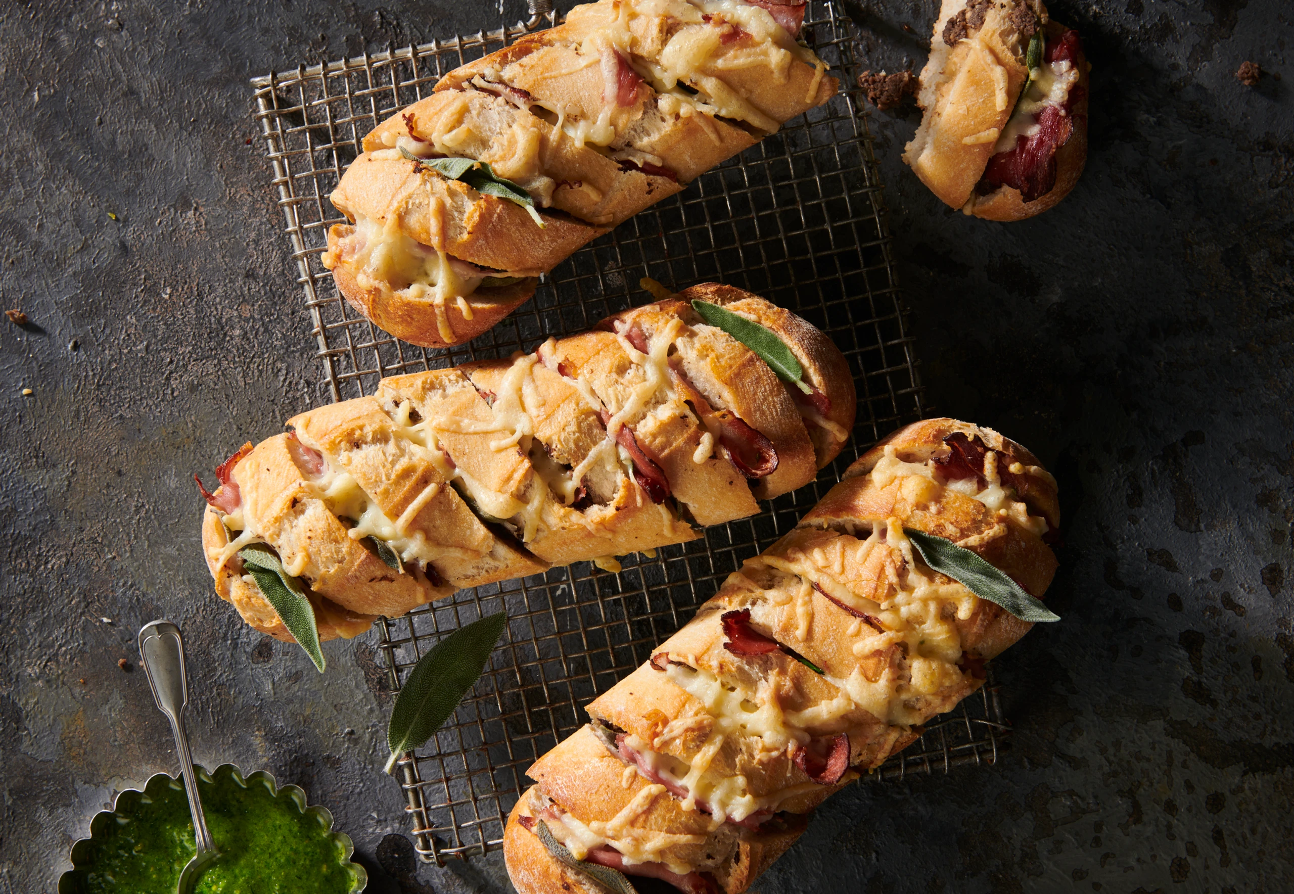 Überbackene Baguettes mit Champignons, Prosciutto und Salbei