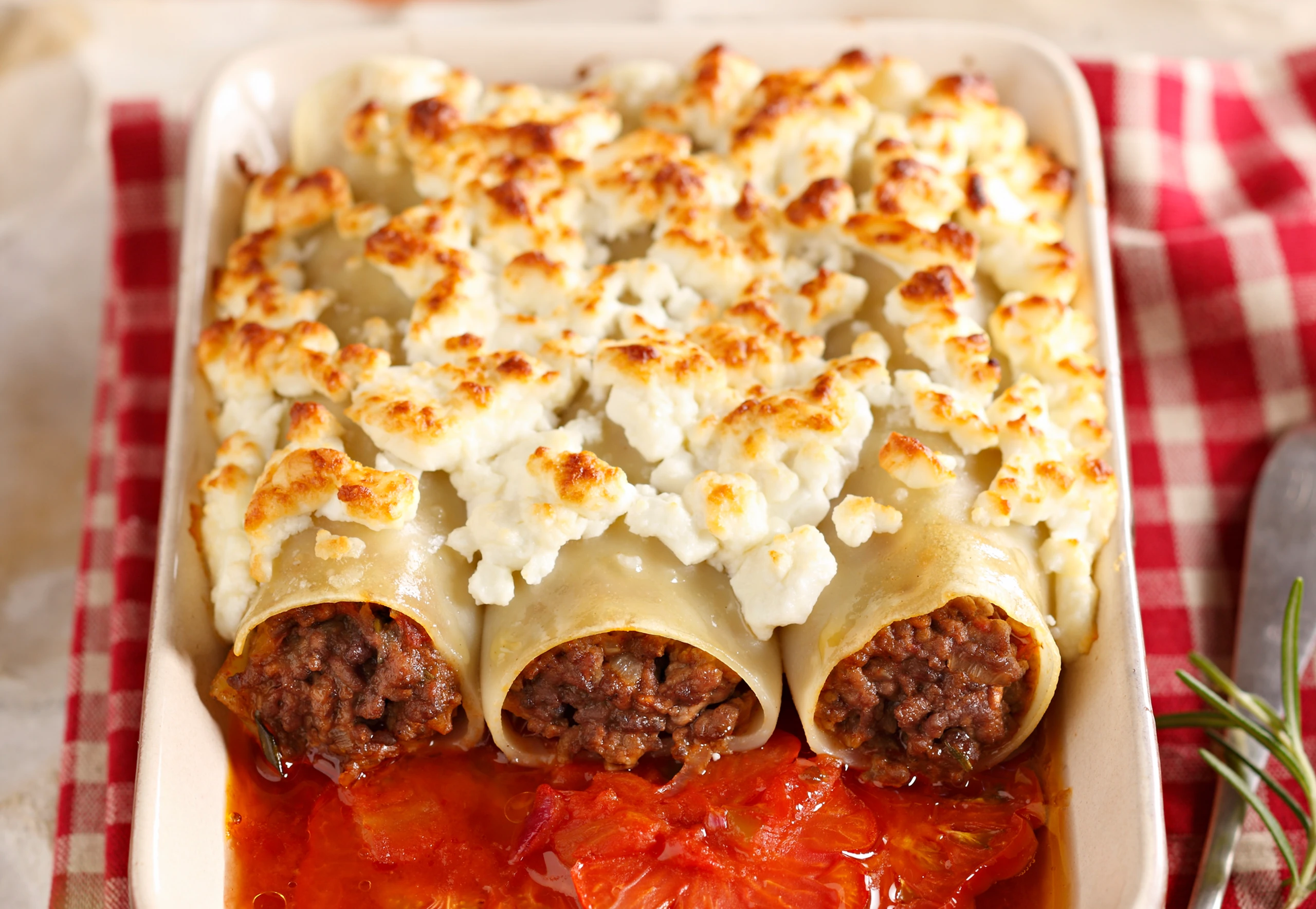 Rohr auf 180°C vorheizen. Paradeiser in Scheiben schneiden und mit den Pelati in 4 Auflaufformen verteilen. Cannelloni mit dem Faschierten füllen, je 3 Stück in die Formen legen. Cannelloni mit etwas Olivenöl beträufeln und mit zerbröseltem Schafkäse bestreuen. Cannelloni im Rohr (mittlere Schiene) ca. 15 Minuten goldbraun überbacken.