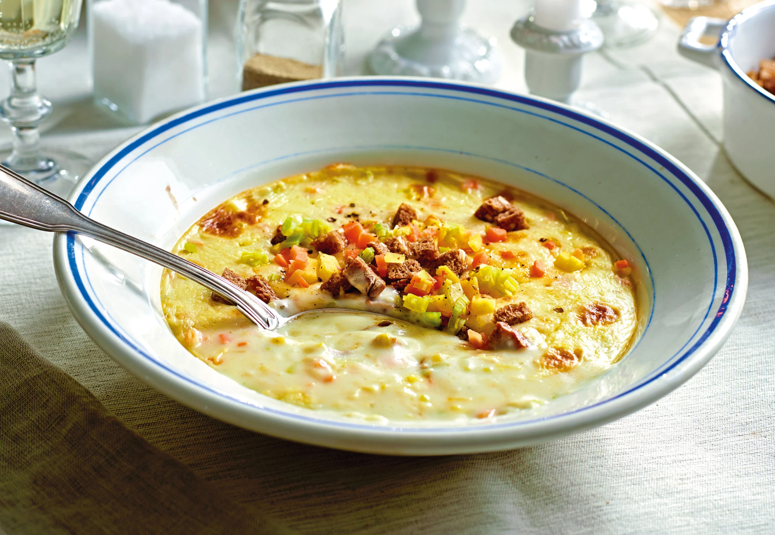 Überbackene Gemüse-Käsesuppe mit Croûtons