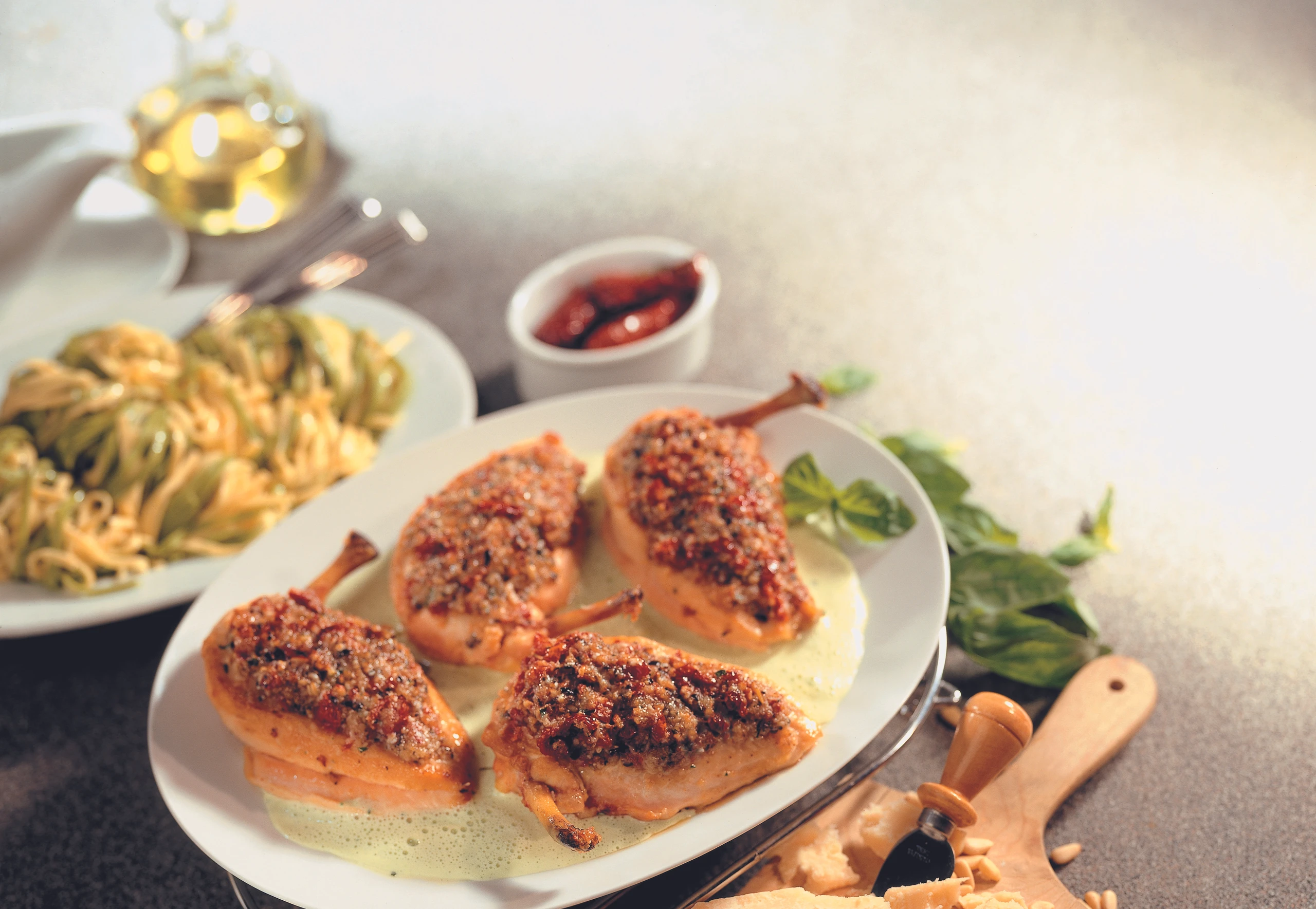 - Überbackene Hühnerfilets mit der Sauce und den Nudeln anrichten.
