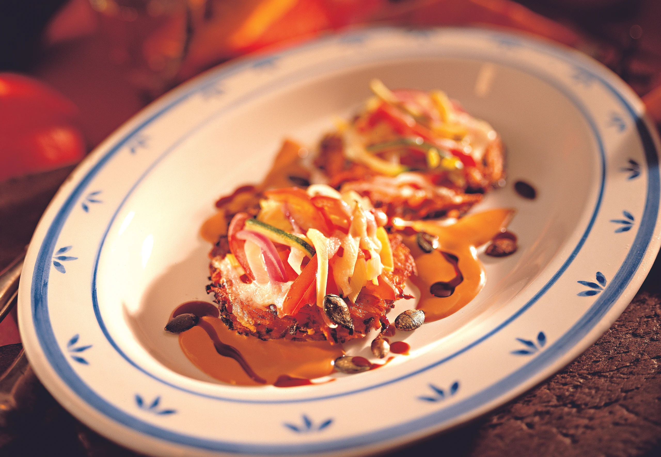 Rohr auf Grill oder starke Oberhitze vorheizen. Puffer auf ein Backblech legen, Gemüsemischung darauf verteilen und mit Käse bestreuen. Puffer ca. 2 Minuten überbacken. Mit Kernölsauce servieren.
