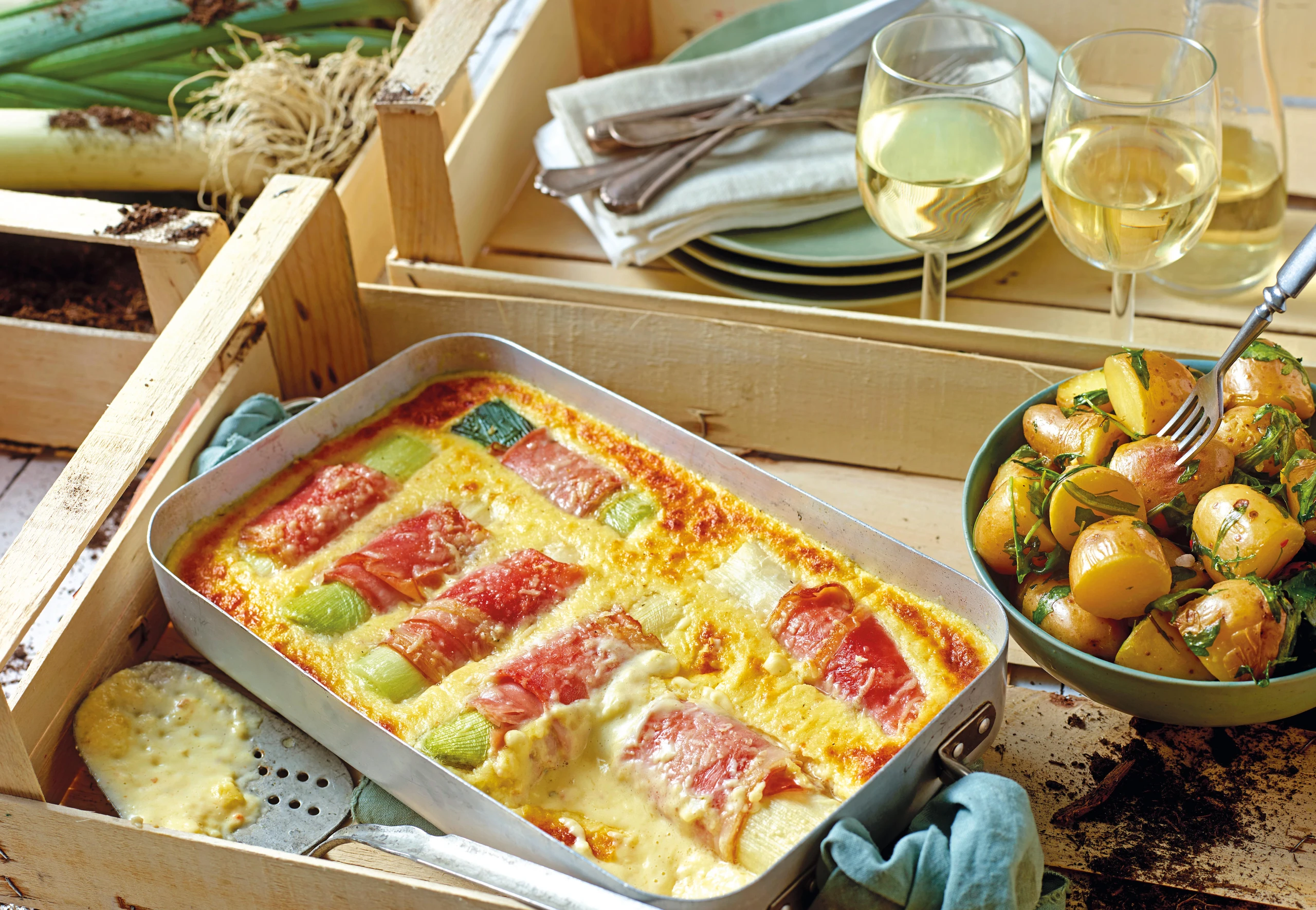 Vom Lauch Wurzeln und dunkelgrüne Blattenden wegschneiden. Lauchstangen jeweils quer vierteln. Reichlich Salzwasser aufkochen und Lauch darin ca. 10 Minuten köcheln. Mit einem Gitterlöffel herausheben und in kaltem Wasser abschrecken. Lauch auf einem Küchentuch gut trocken tupfen. Lauch mit Schinken so umwickeln, dass an den Enden jeweils ca. 3 cm vom Lauch freibleiben.