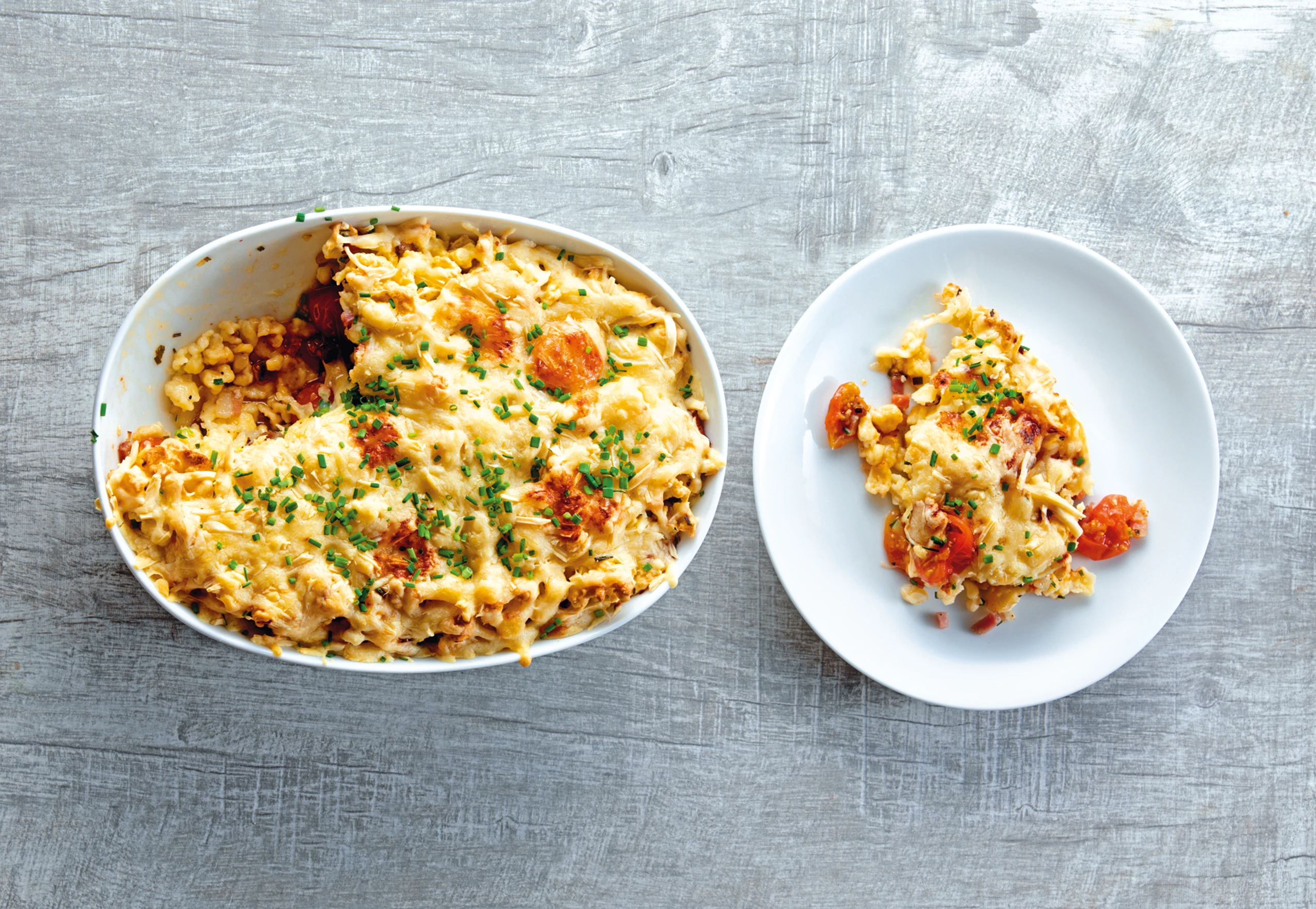 In einer Pfanne Öl erhitzen und die Zwiebel darin goldgelb rösten. Nockerl mit Zwiebel, Speck, Paradeisern und zwei Dritteln vom Schnittlauch verrühren. Mit Salz und Pfeffer würzen, in der Form verteilen und mit Käse bestreuen.