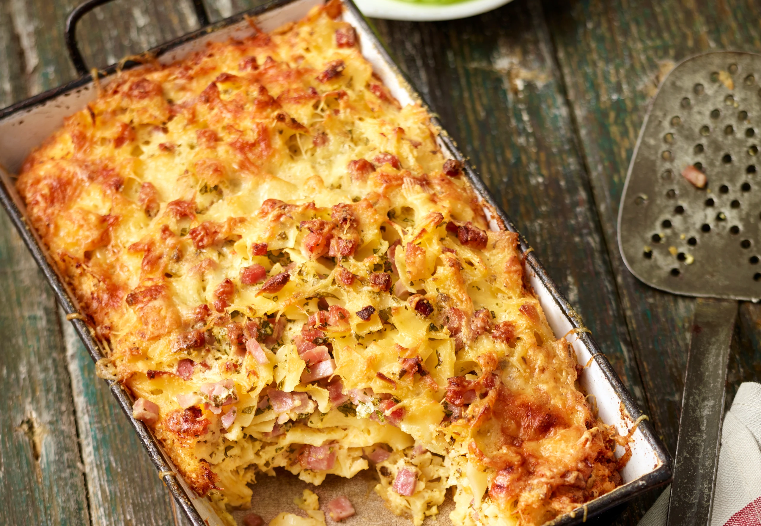 Schinkenfleckerln mit zerlassener Butter beträufeln und im Rohr (mittlere Schiene / Gitterrost) ca. 45 Minuten backen. Dazu passt grüner Salat.