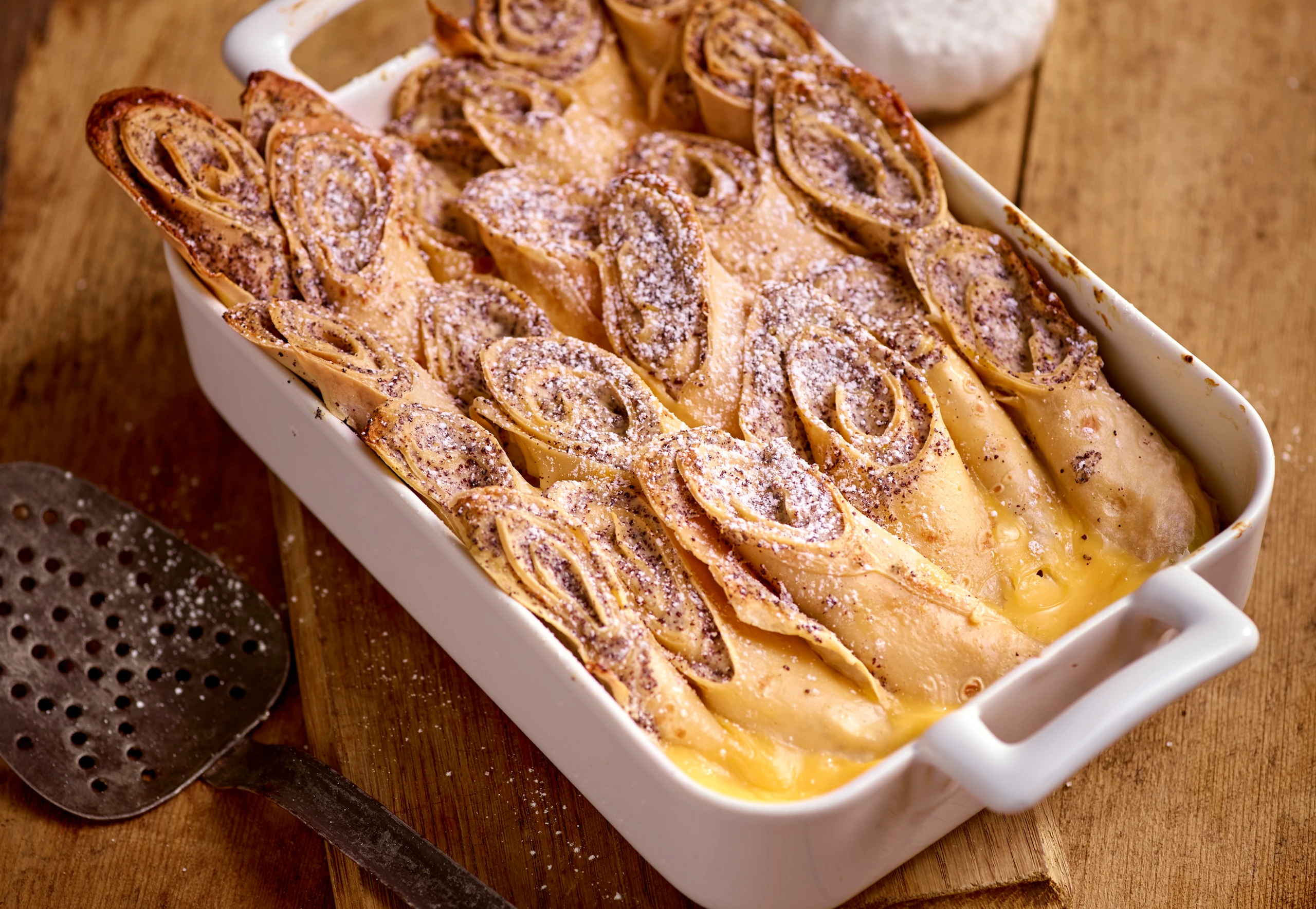 Fülle auf den Palatschinken verstreichen, einrollen, quer halbieren und in die Form schichten. Palatschinken im Rohr (untere Schiene / Gitterrost) ca. 10 Minuten backen.