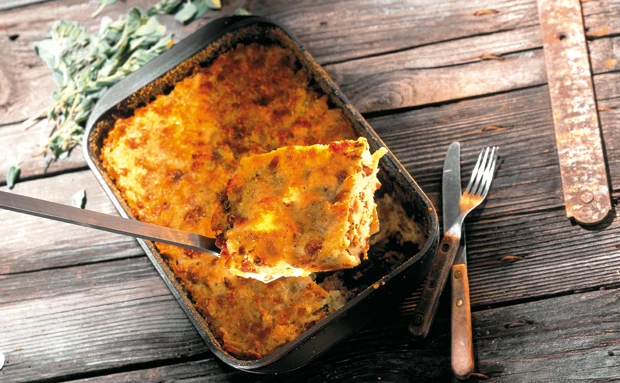 - Schinkenfleckerln mit zerlassener Butter beträufeln und ca. 35 Minuten im Rohr (mittlere Schiene / Gitterrost) backen.