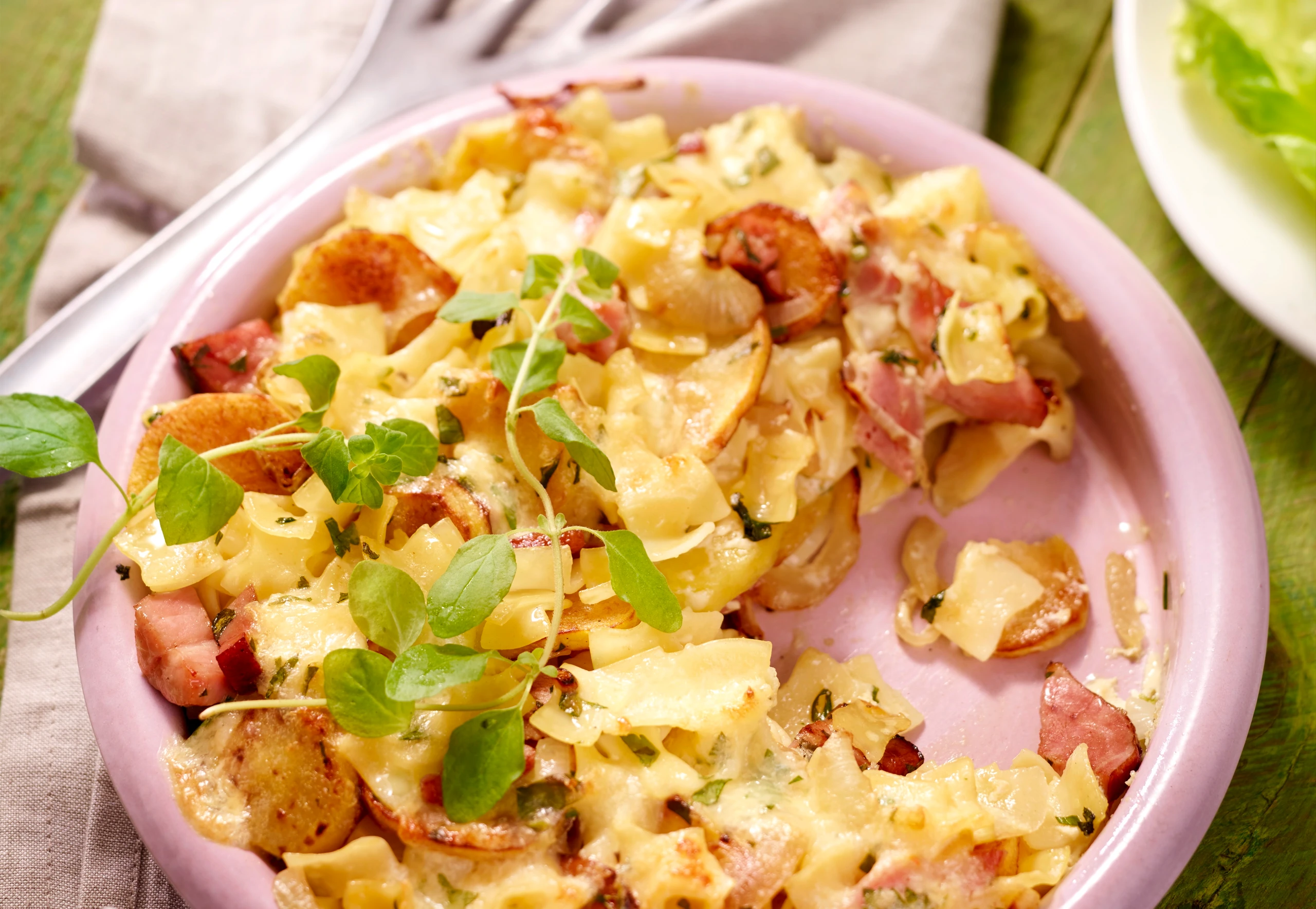 Erdäpfel kochen, schälen und in Scheiben schneiden. Teigwaren in leicht gesalzenem Wasser bissfest kochen, abseihen und abschrecken. Zwiebeln schälen, halbieren und in dünne Scheiben schneiden. Schinken würfeln, Käse reiben, Petersilie hacken.