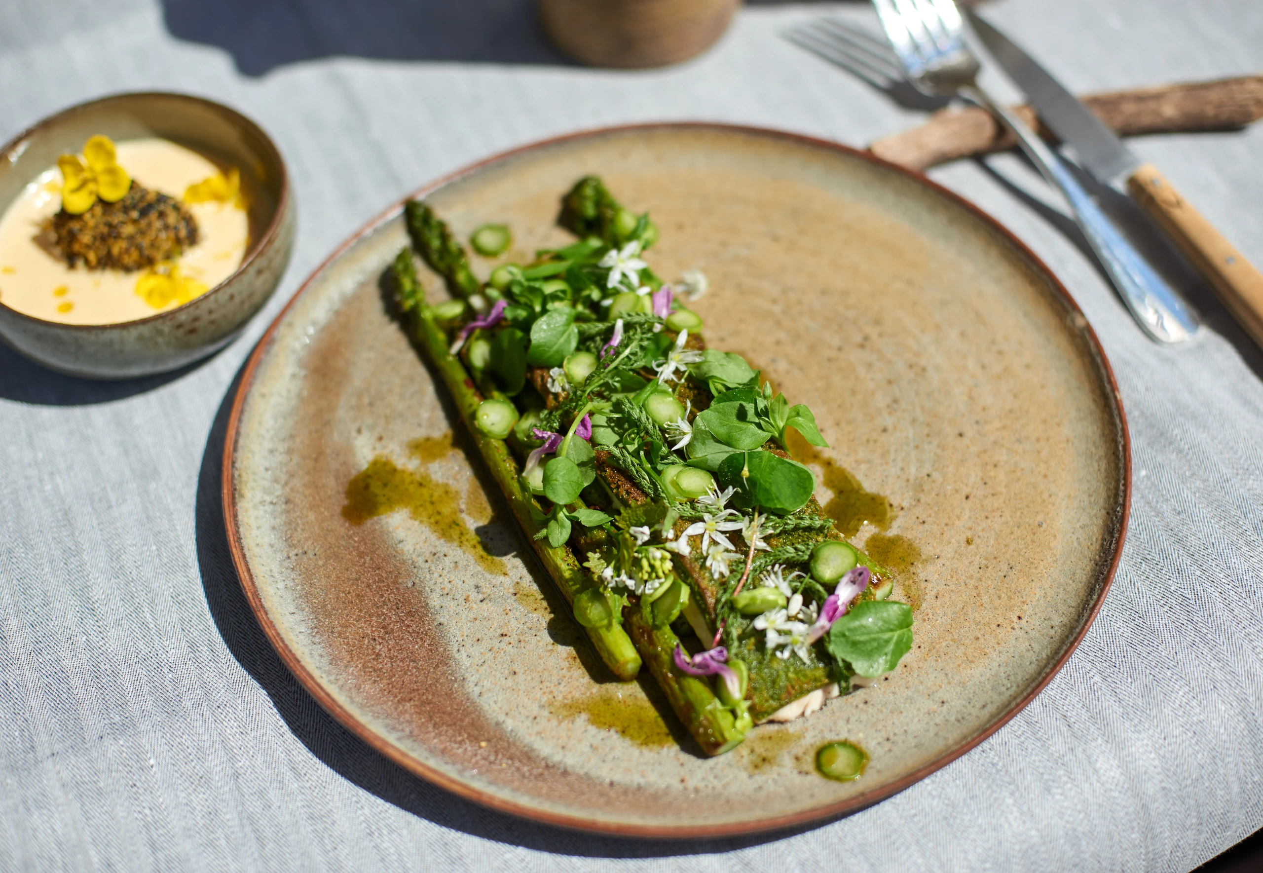 Überbackener Saibling mit Spargel, Wildkräutern und Rapserdäpfeln