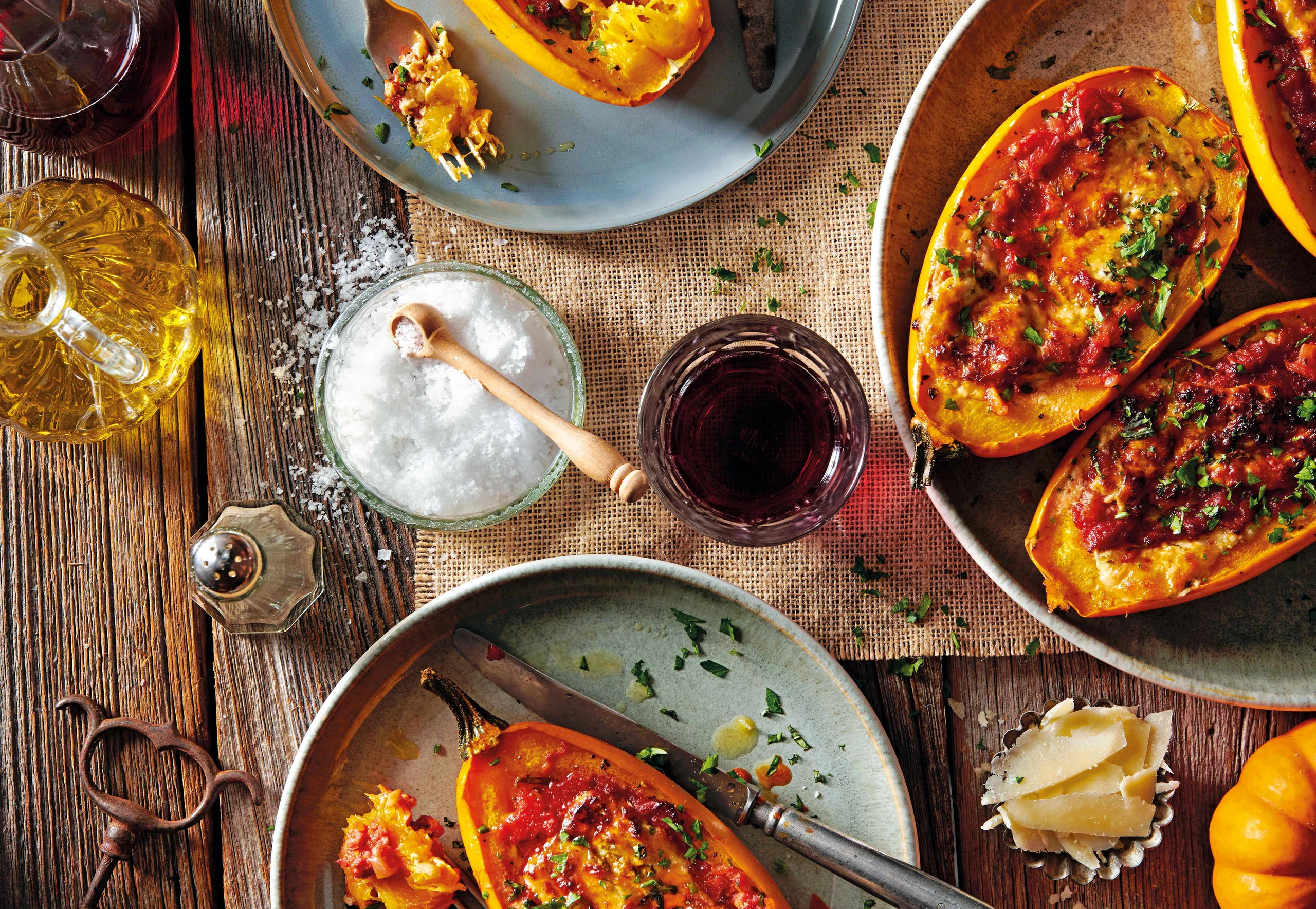Kürbishälften aus dem Rohr nehmen und mit der Hälfte der Ricottamasse füllen. Mit Sugo auffüllen, übrige Ricottamasse darauf verteilen. Im Rohr ca. 30 Minuten goldbraun backen.