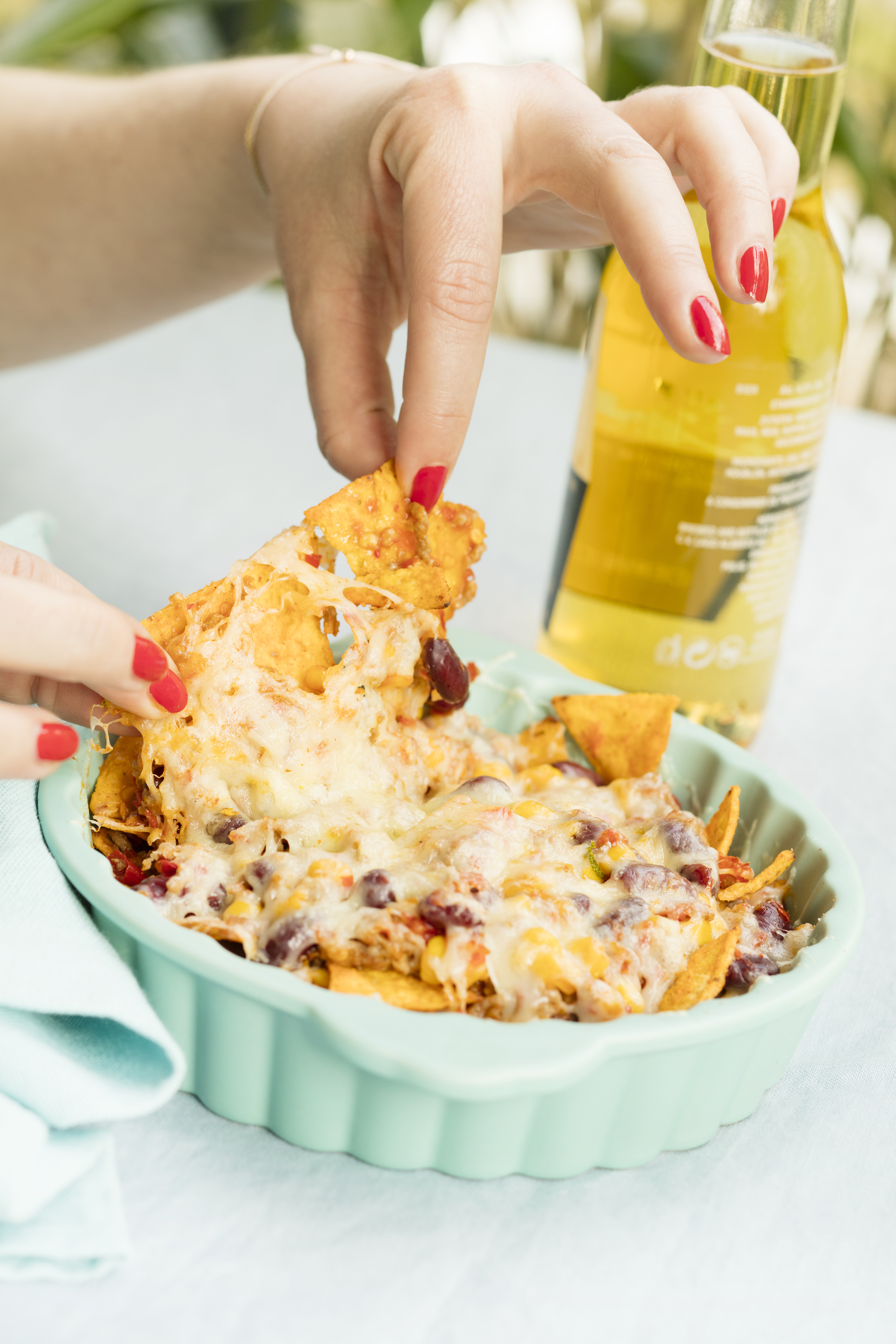 Rohr auf Grillstellung vorheizen. 4 Auflaufförmchen (Ø ca. 14 cm) mit der Hälfte der Tortillachips füllen, Chili darauf verteilen, mit den übrigen Tortillachips belegen und dick mit Käse bestreuen. Chili im Rohr (mittlere Schiene / Gitterost) überbacken.