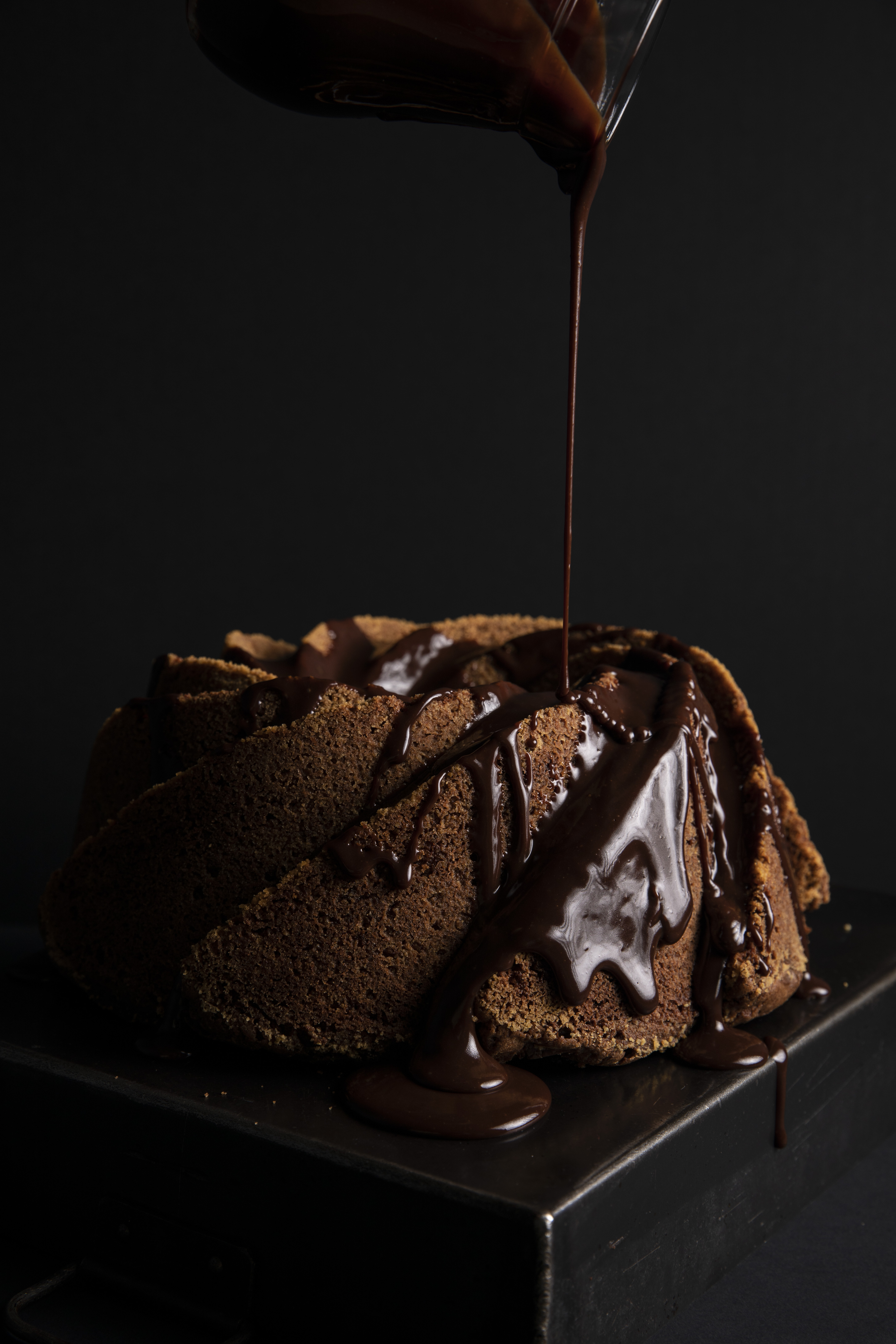 Für die Glasur Obers aufkochen und über die Kuvertüren leeren. 5 Minuten ziehen lassen und dann glatt rühren. Glasur über den Gugelhupf leeren.
