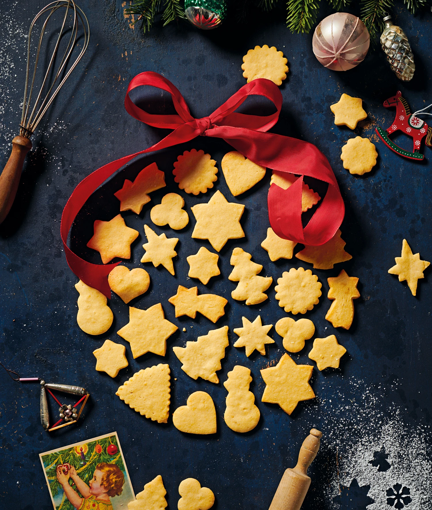 Rohr auf 180°C vorheizen. Backbleche mit Backpapier belegen. Einen Bogen Backpapier abziehen und Kekse ausstechen. Kekse auf die Bleche legen und im Rohr ca. 13 Minuten hell backen. Herausnehmen und auskühlen lassen.