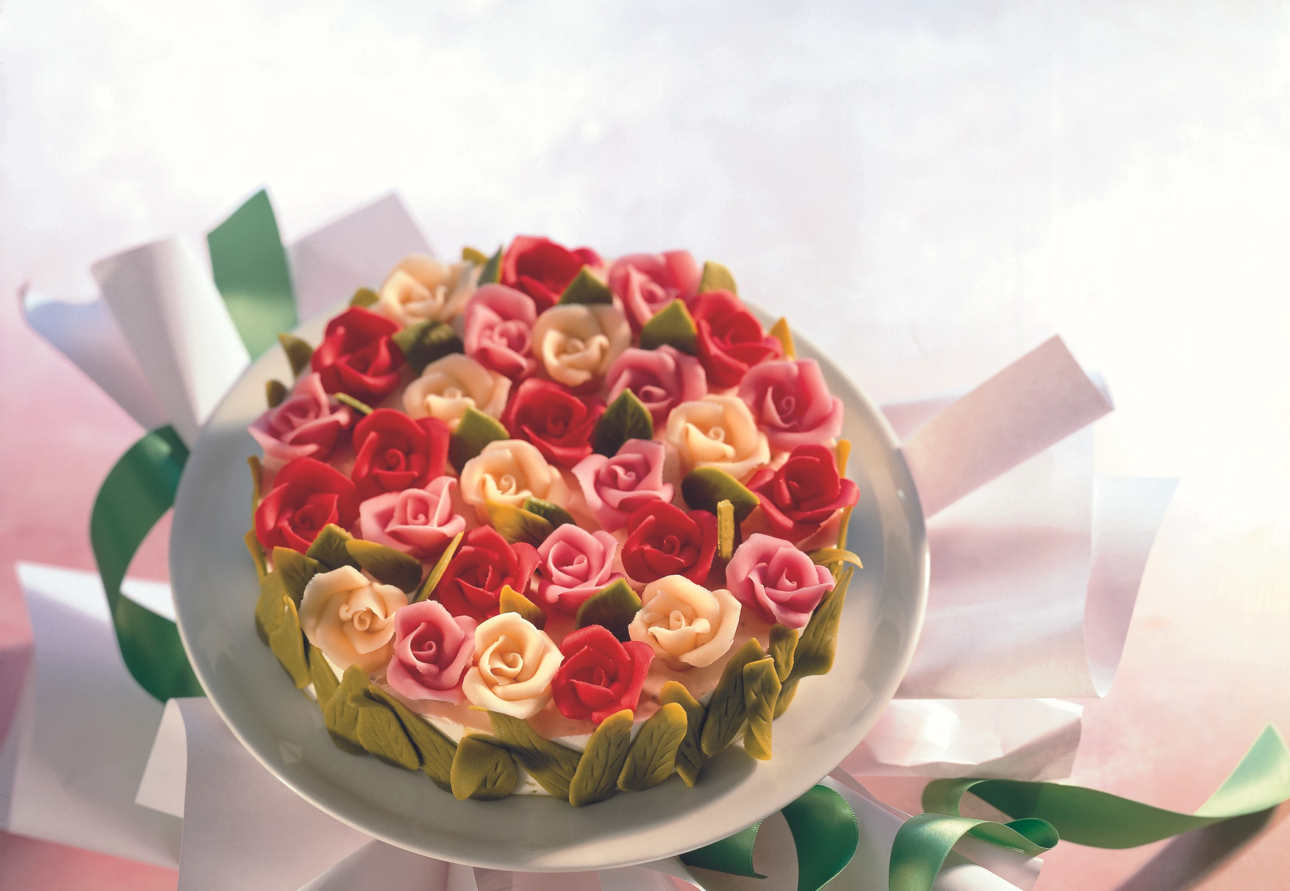 Creme auf den Tortenboden füllen. Torte mit Klarsichtfolie zudecken und ca. 6 Stunden kühlen. Torte mit Marzipan-Rosen und -Blättern verzieren.