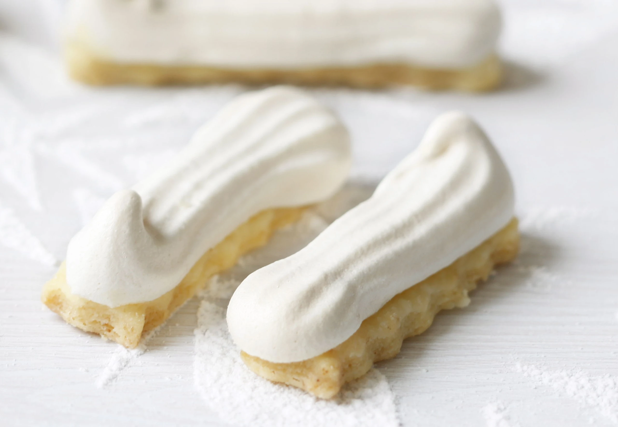 Rohr auf 180°C vorheizen. 3 Backbleche mit Backpapier belegen. Teig halbieren und auf einer bemehlten Arbeitsfläche je 30 x 21 cm groß ausrollen. Mit einem Teigrad je 36 Stangerln (7 x 2,5 cm) ausradeln und auf die Bleche legen. Baiser mit einem Dressiersack (Sterntülle) auf die Stangerln dressieren, Stangerl im Rohr (mittlere Schiene) ca. 11 Minuten backen.