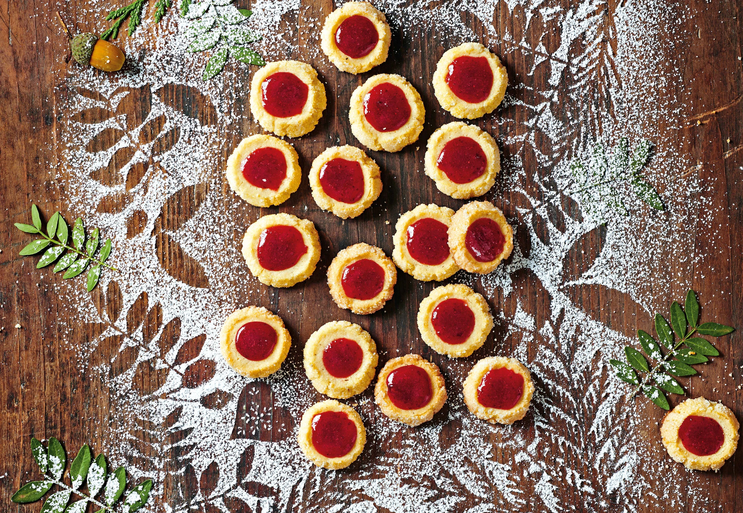 Kekse herausnehmen und noch heiß in der Mitte etwas eindrücken, so dass eine Mulde entsteht. Das funktioniert am besten mit einem Parisienneausstecher oder Teelöffel.