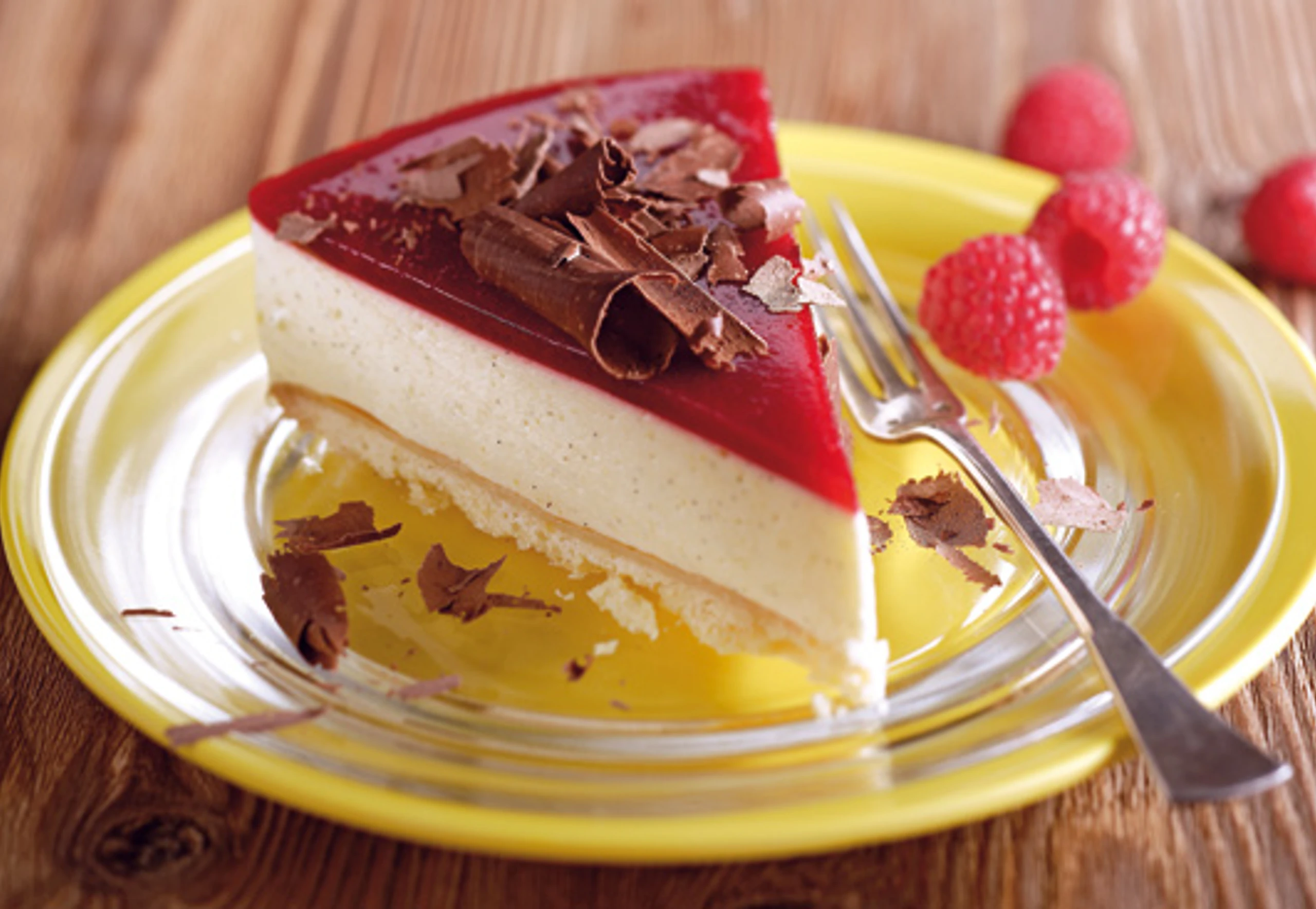 - Torte aus der Form lösen, mit Schokoladespänen und Himbeeren garnieren.