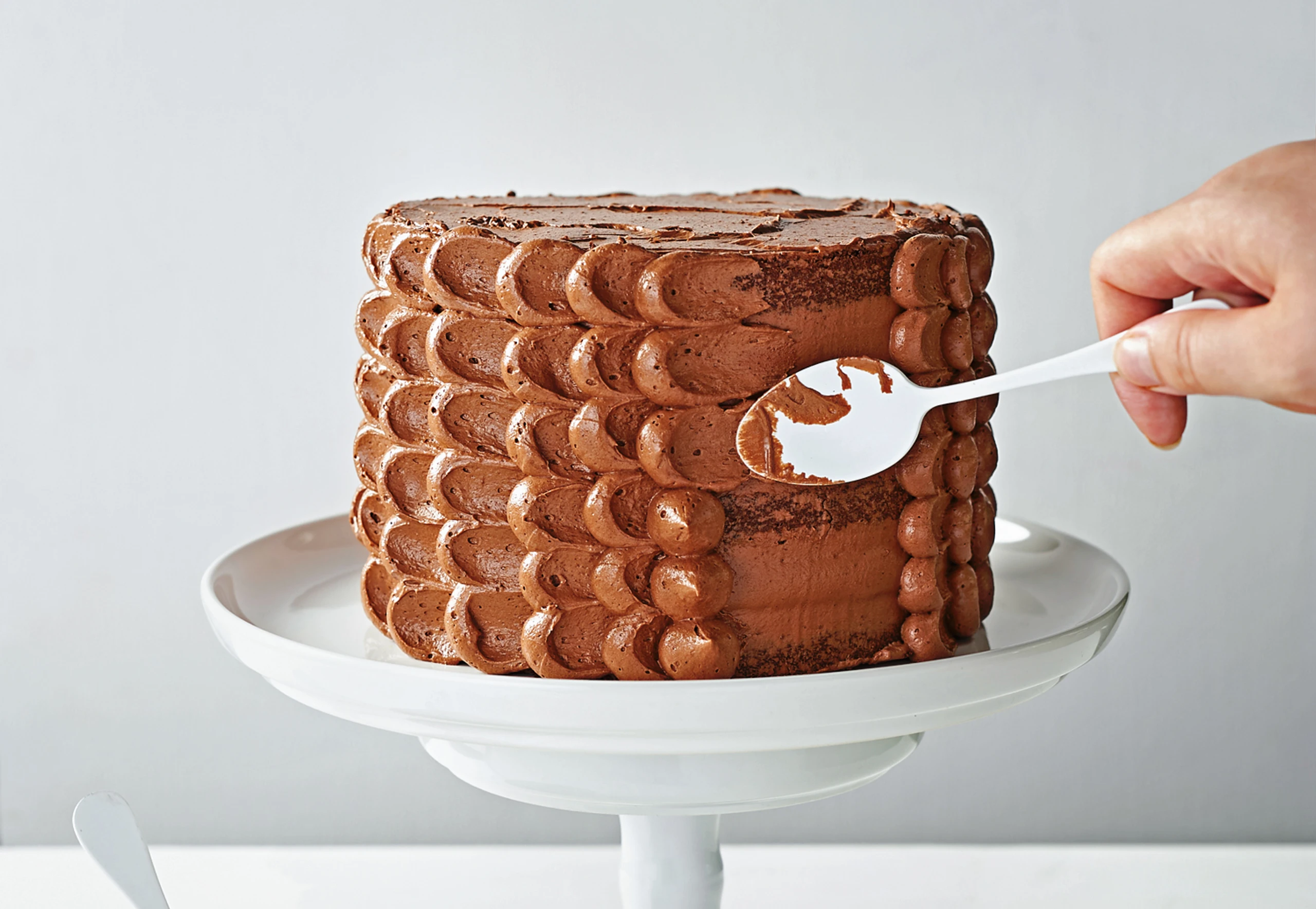 Für das Muster übriges Frosting in den Dressiersack füllen und von oben nach unten Tupfen aufdressieren. Einen Teelöffel an den Tupfen ansetzen und nach rechts wegziehen. Den Löffel immer wieder abwischen. Torte für mind. 3 Stunden kalt stellen.