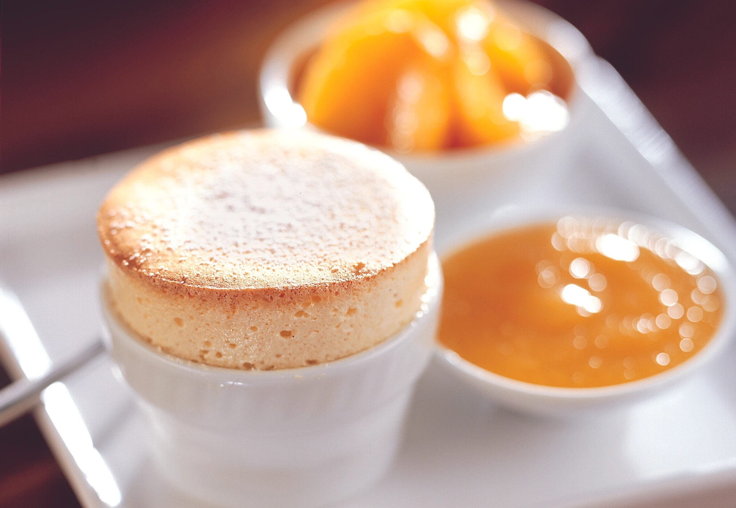 Förmchen bis knapp unter den Rand mit der Masse füllen und in die vorbereitete Metallform stellen – die Förmchen sollen halbhoch im Wasserbad stehen. Soufflés ca. 18 Minuten backen. Aus dem Rohr nehmen und sofort servieren.