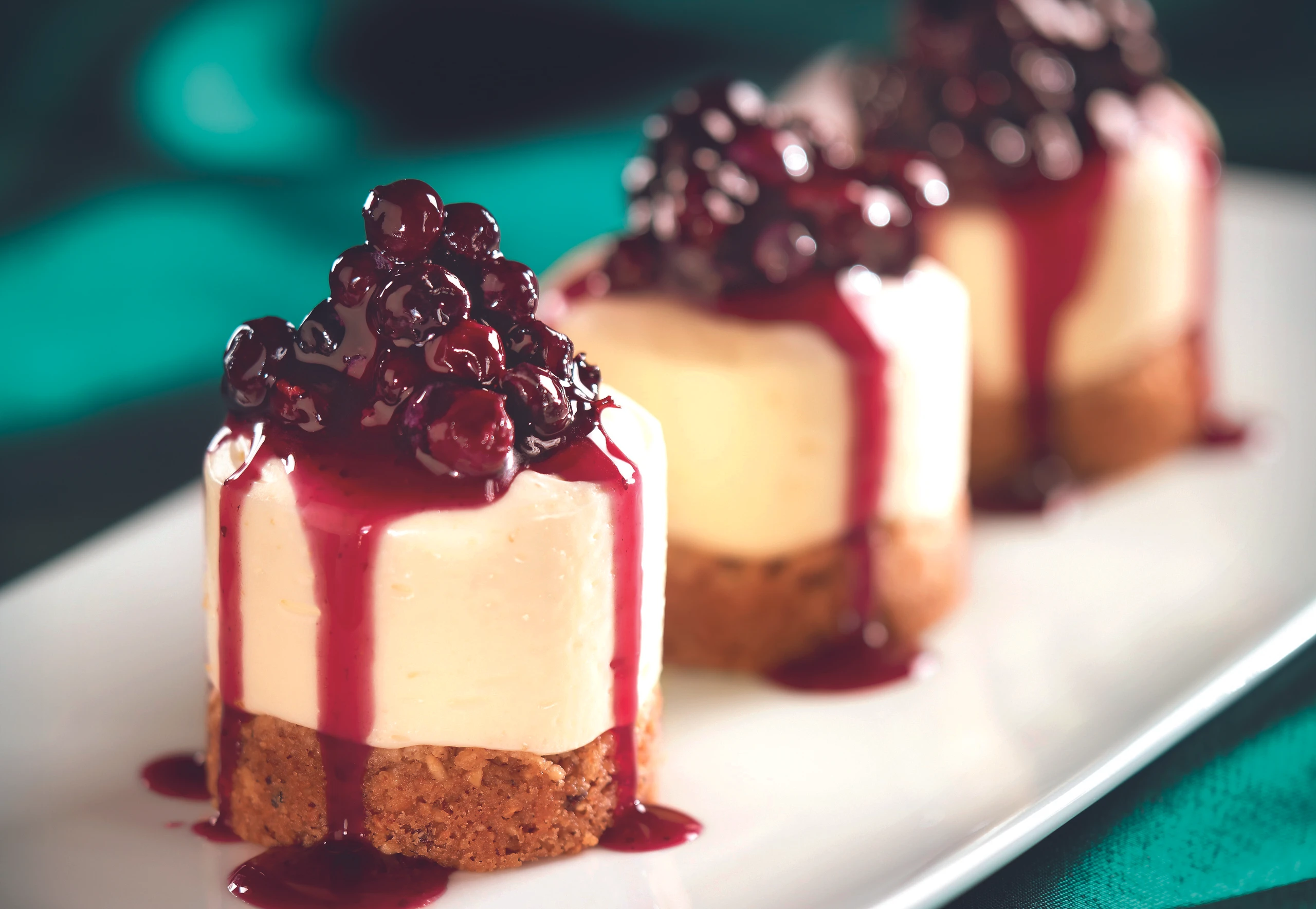 - Törtchen aus dem Kühlschrank nehmen, mit einem kleinen Messer vom Rand der Ringe schneiden. Ringe abheben. Törtchen mit den Heidelbeeren garniert servieren.