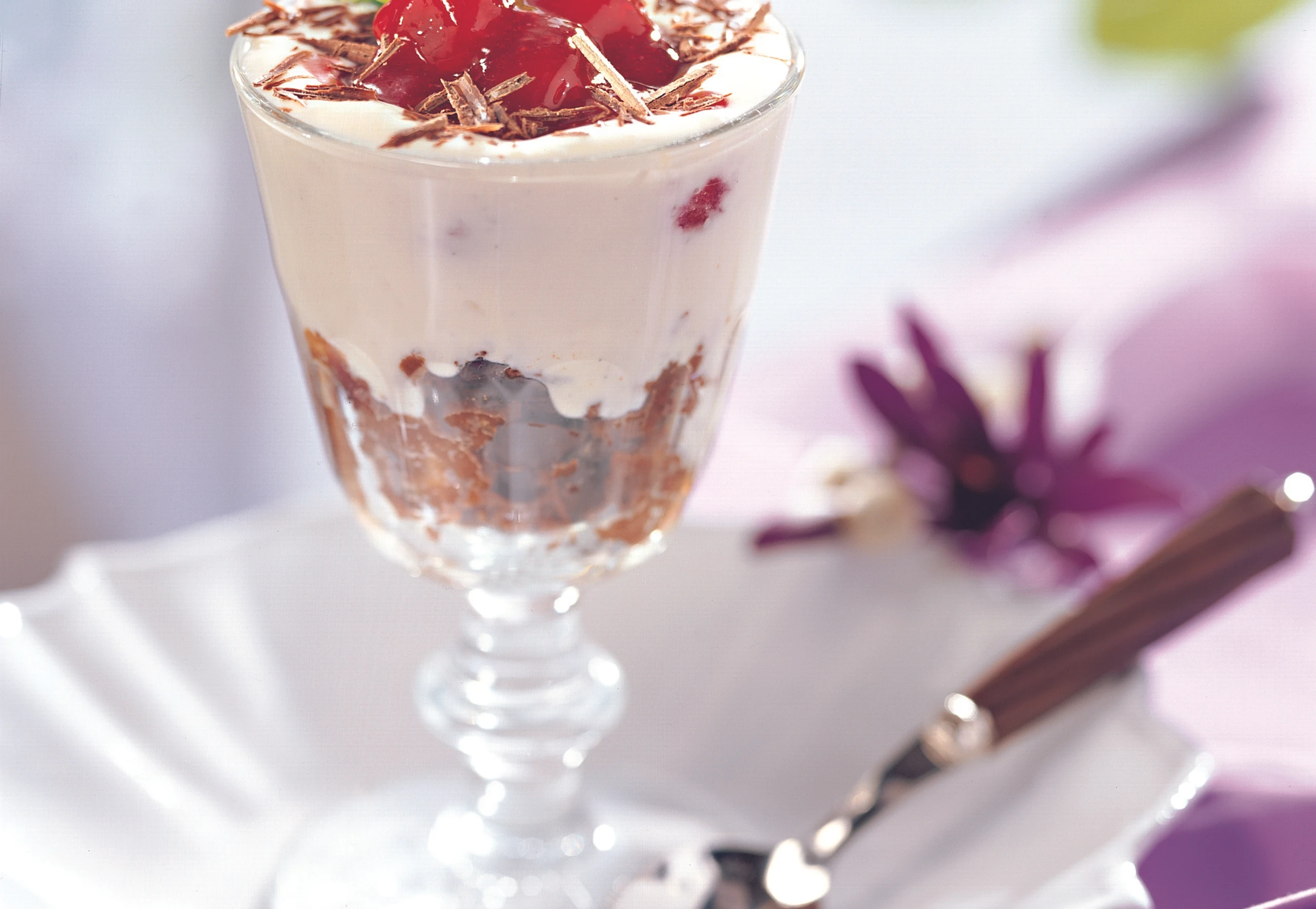 Sauerrahm unter den Pudding mixen. Gläser zu einem Drittel mit den Kuchenstücken füllen, Pudding darüber gießen, mit Himbeeren, Minze und Schokospänen garnieren.