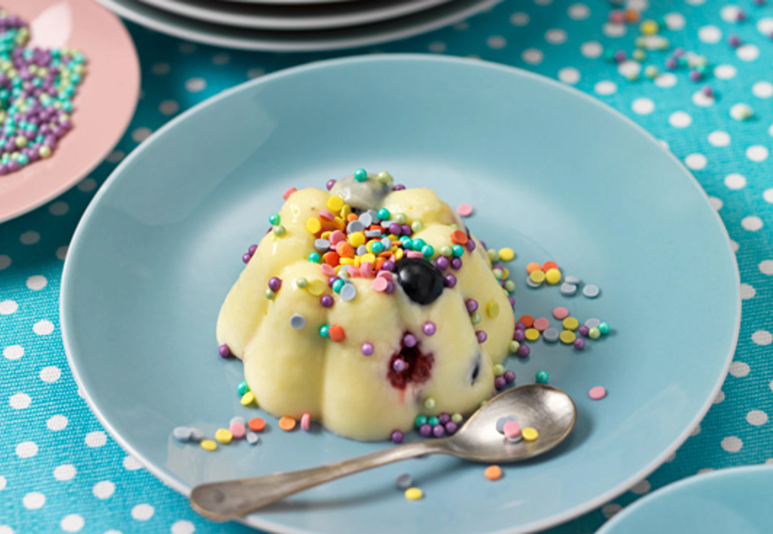 Förmchen vor dem Servieren kurz in heißes Wasser tauchen, Cremen auf Teller stürzen und mit Schoko & Crispies Mix und Party Mix dekorieren.