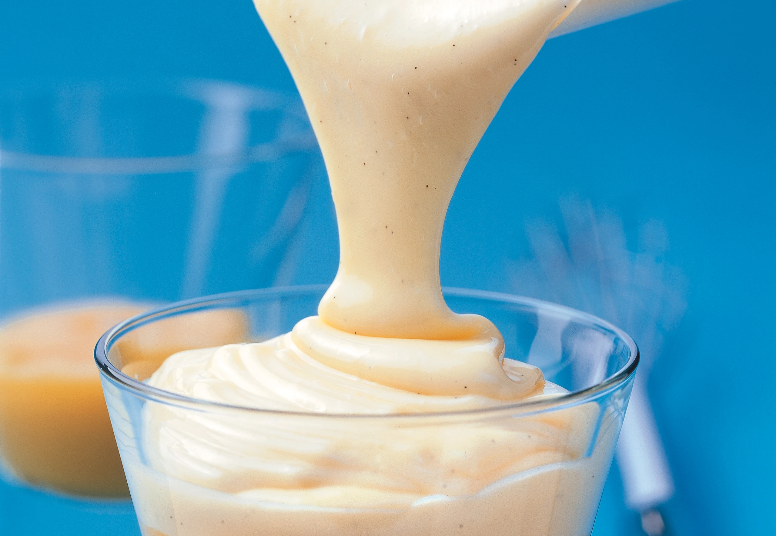 Dotter verquirlen, rasch in die Vanillemilch rühren und bei schwacher Hitze unter Rühren erwärmen (nicht aufkochen). Stärke einrühren und die Creme nun unter Rühren aufkochen. Sobald sie eindickt, Topf in ein kaltes Wasserbad stellen und Creme unter Rühren ca. 5 Minuten abkühlen lassen.