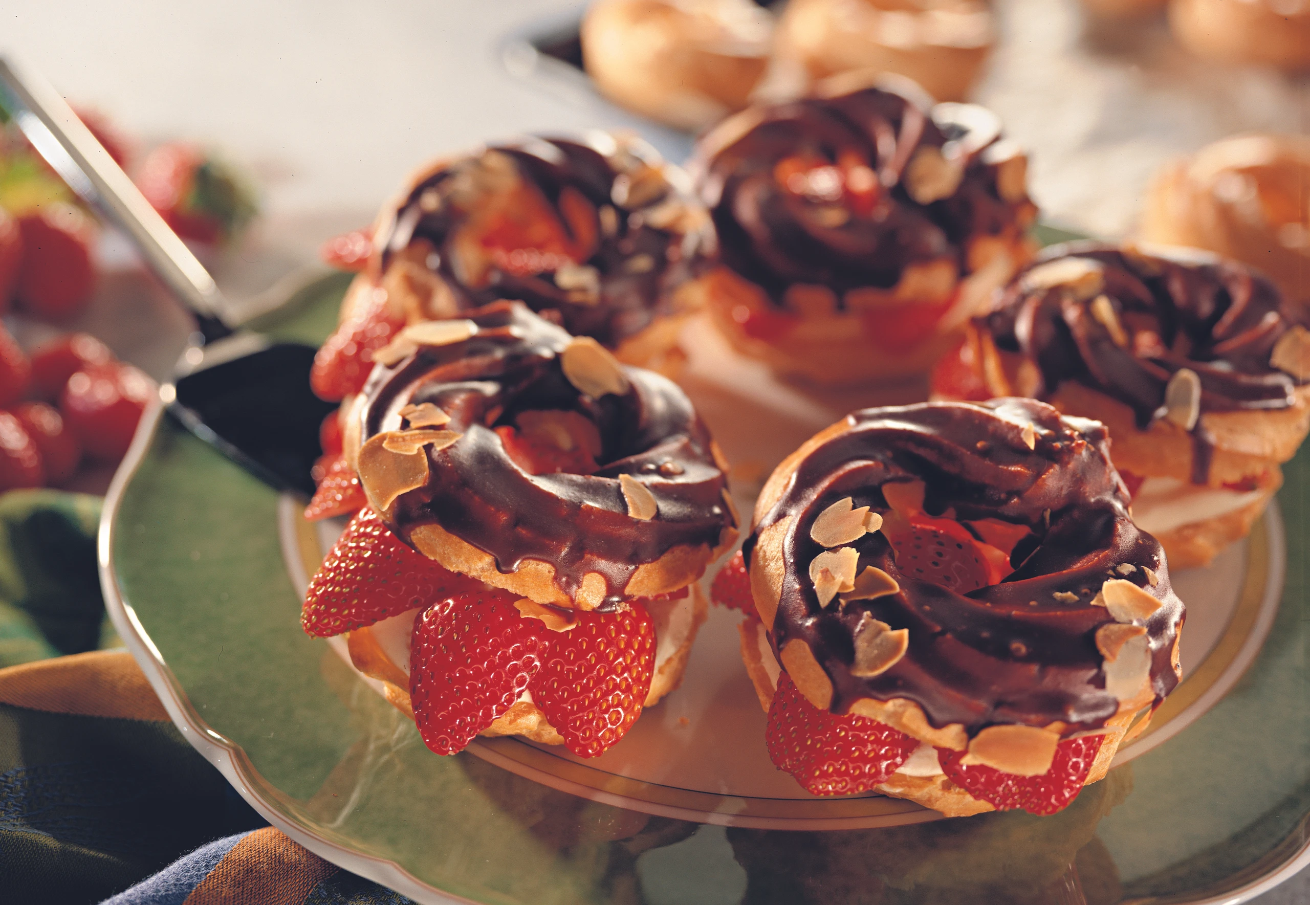 - Die Brandteigringe durchschneiden, Deckel zur Seite legen. Vanillecreme in einen Dressiersack mit Sterntülle füllen und auf die Böden dressieren. Creme mit den Erdbeerstücken belegen, Teigdeckel daraufsetzen und behutsam andrücken. Brandteigringe sofort servieren.