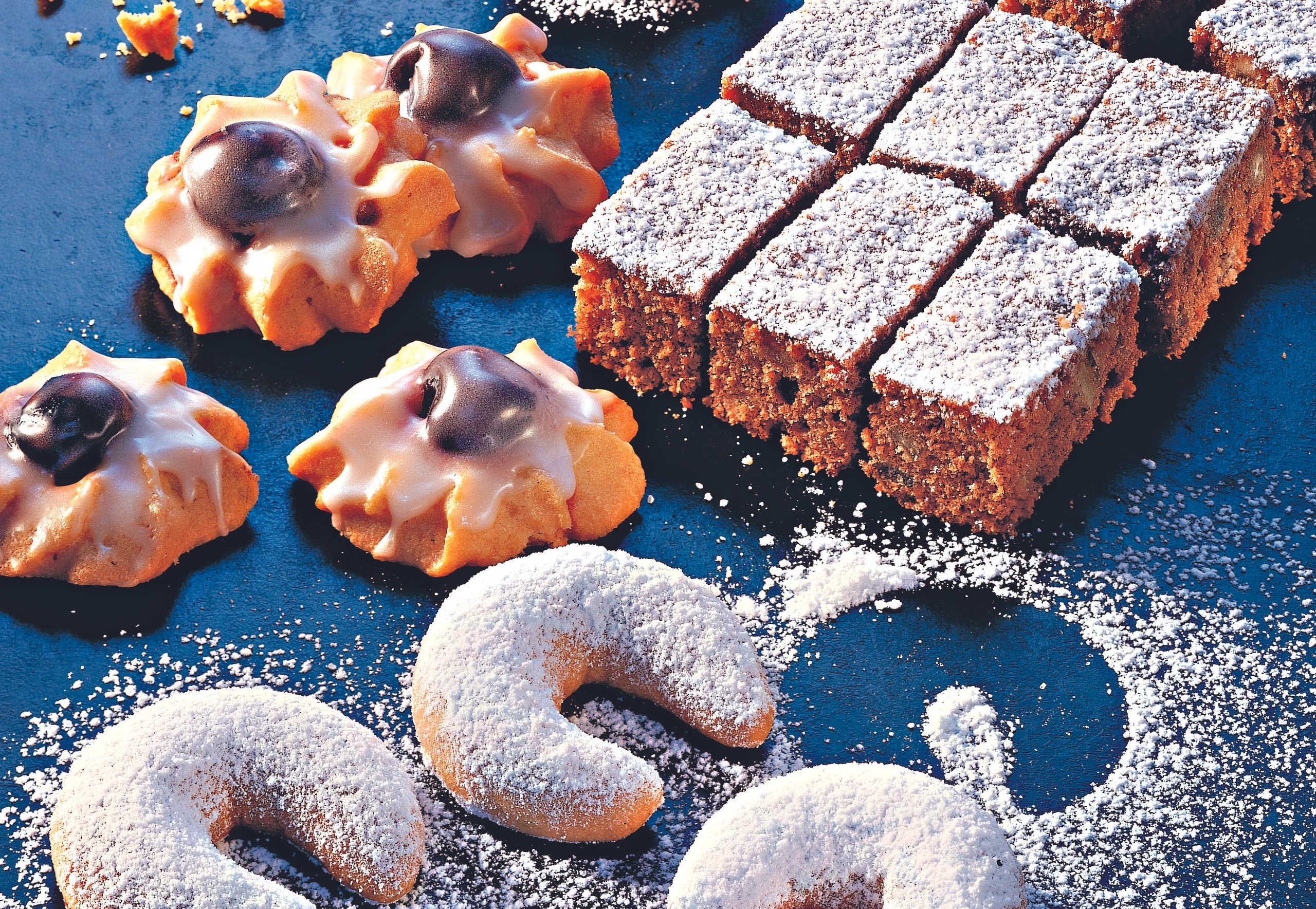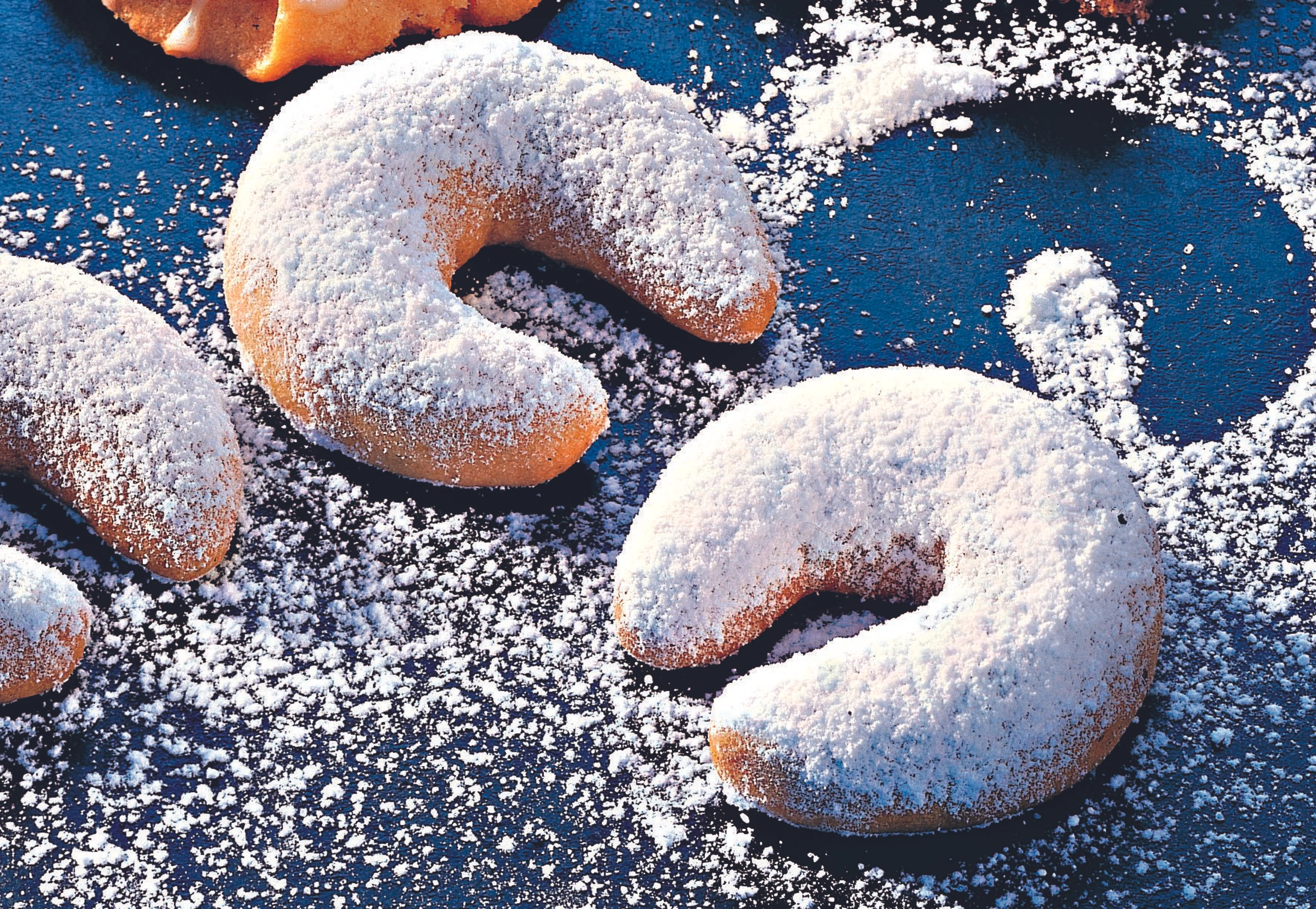 Kipferl aus dem Rohr nehmen und sofort mit einer Mischung aus Staub- und Vanillezucker bestreuen.