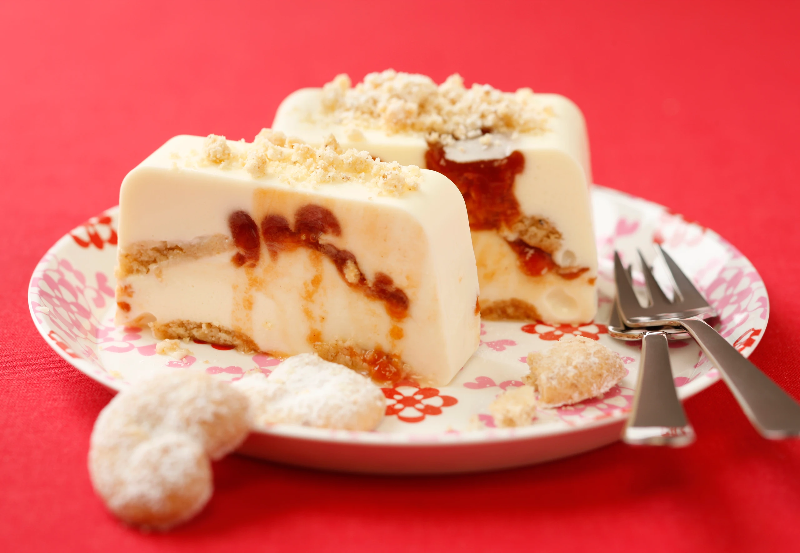 Die Hälfte der Topfenmasse in der Form verstreichen, mit der Hälfte von den Vanillekipferln belegen und mit der Hälfte der Marmelade beträufeln. Übrige Topfenmasse daraufstreichen, mit restlicher Marmelade und Vanillekipferln abschließen. Terrine mit Frischhaltefolie zudecken und für ca. 5 Stunden in den Kühlschrank stellen.
