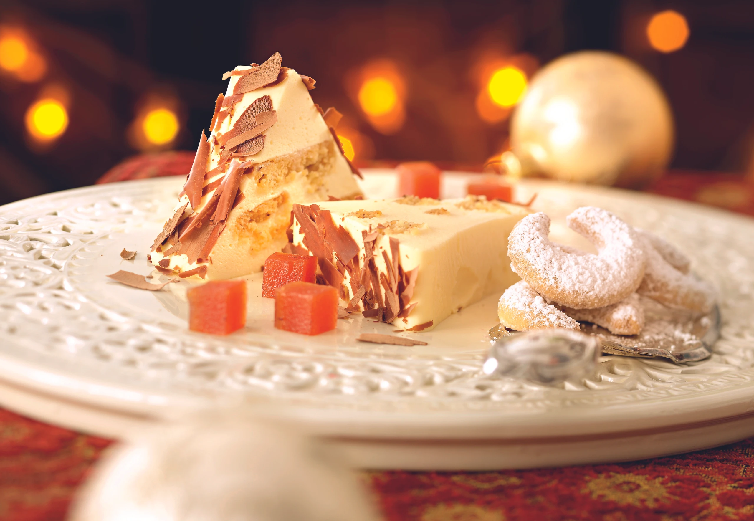 Terrine stürzen, in Scheiben schneiden, mit Schokospänen garnieren, mit Vanillekipferln und Apfelmuswürfeln servieren.