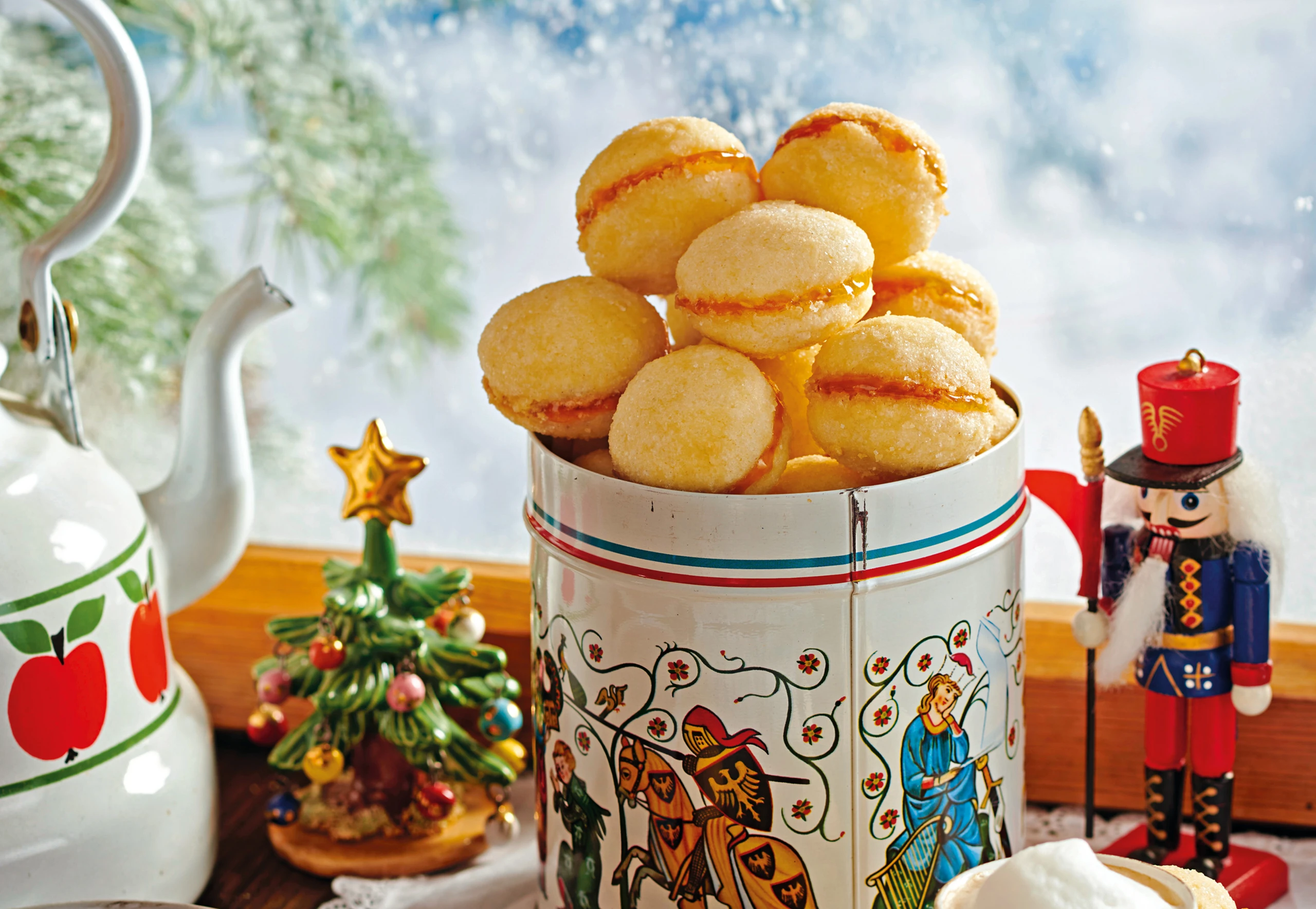 Herausnehmen und auskühlen lassen. Die Hälfte der Kekse mit Marillenmarmelade bestreichen. Marmelade antrocknen lassen und die Vanilleküsse mit den übrigen Keksen zusammensetzen.