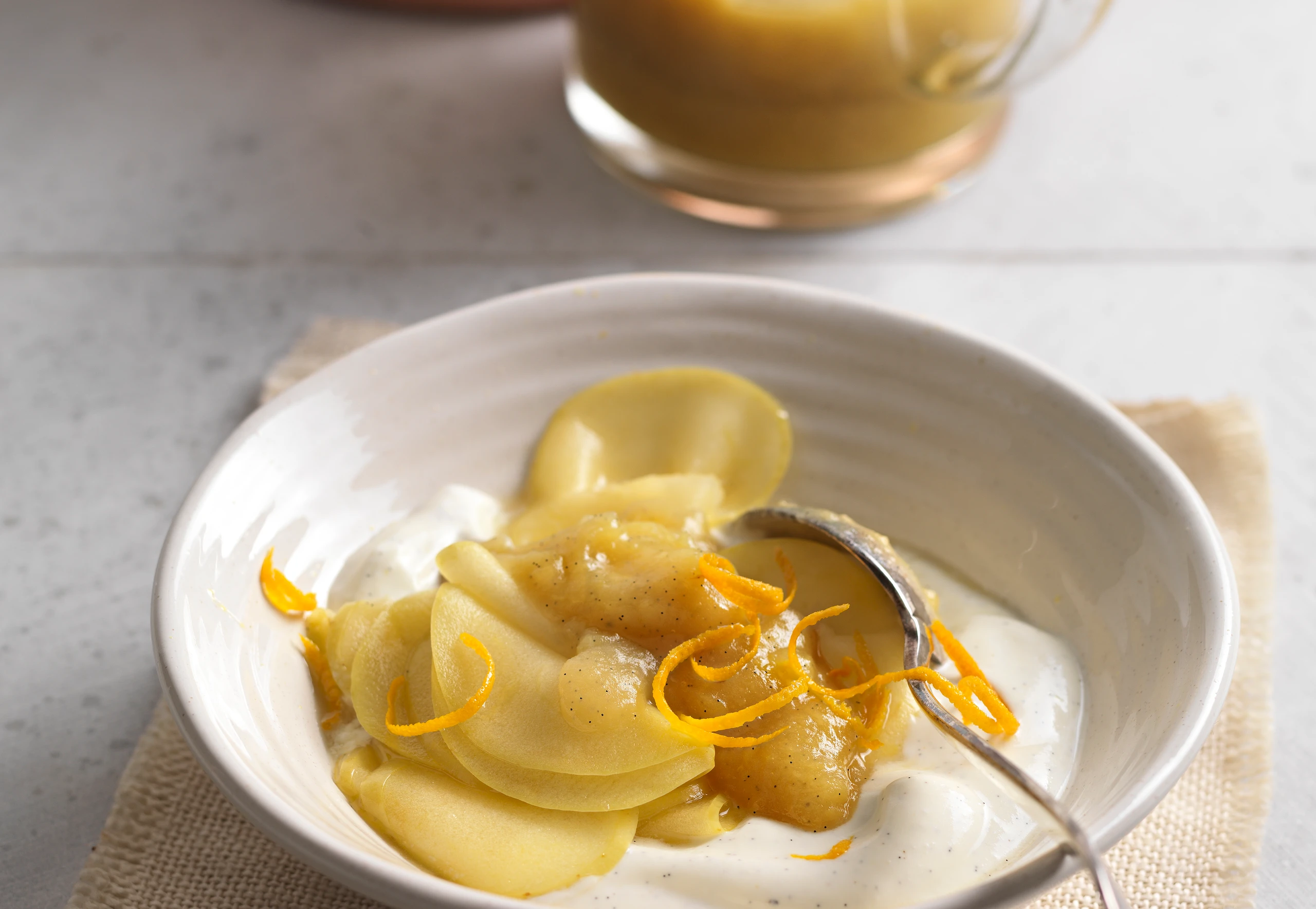 Für den Vanilleschaum Obers dickcremig aufschlagen. Rahm, Zucker und Vanillemark kurz verrühren, Obers unterheben. Vanilleschaum in Schüsserln verteilen, Apfelscheiben und Apfelpüree darauf anrichten und mit Orangenzesten garniert servieren.
