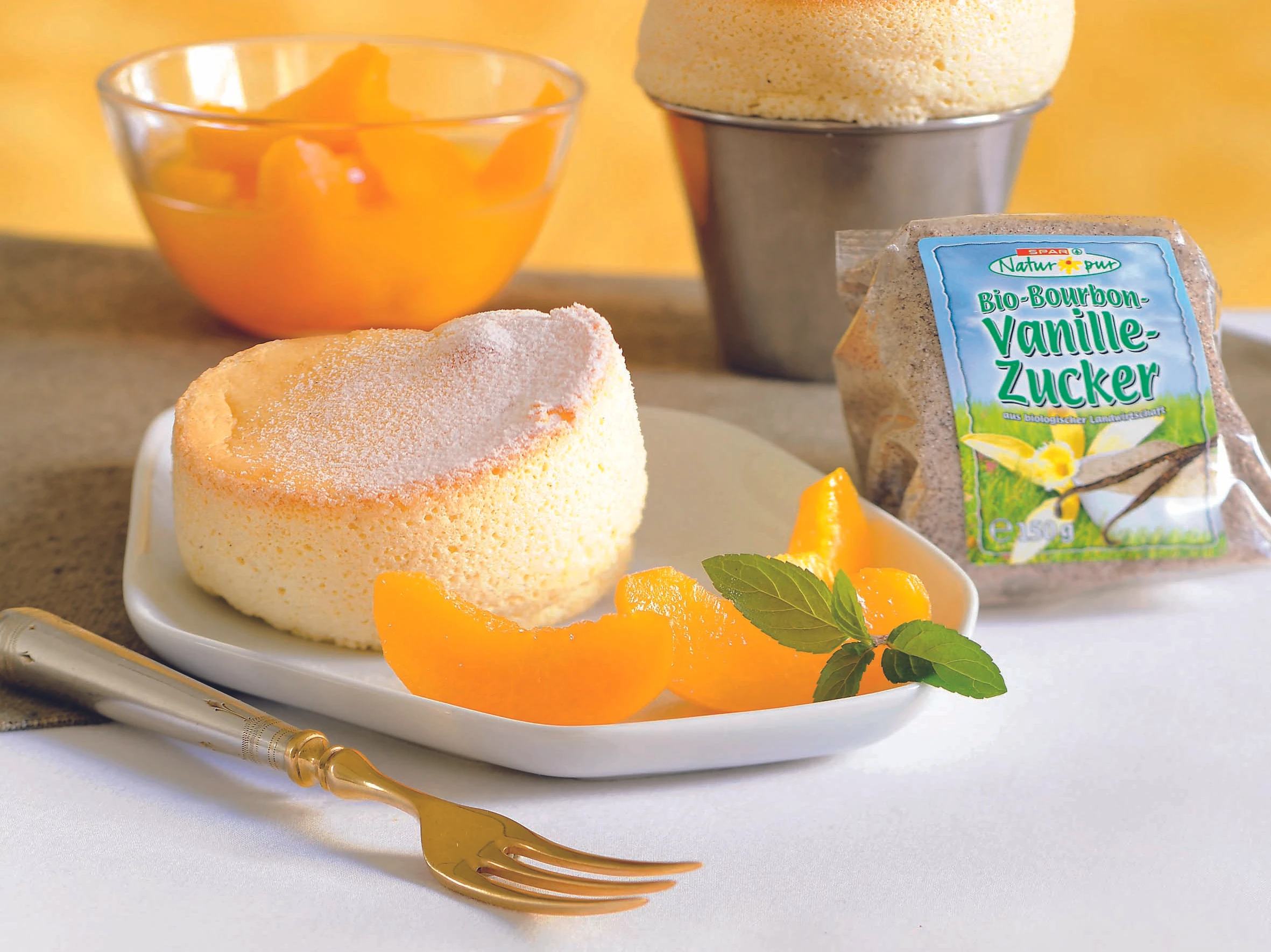 Masse in die Formen füllen, im Rohr in einem Wasserbad ca. 20 Minuten backen. Soufflés aus den Formen stürzen, sofort mit den Pfirsichspalten servieren.