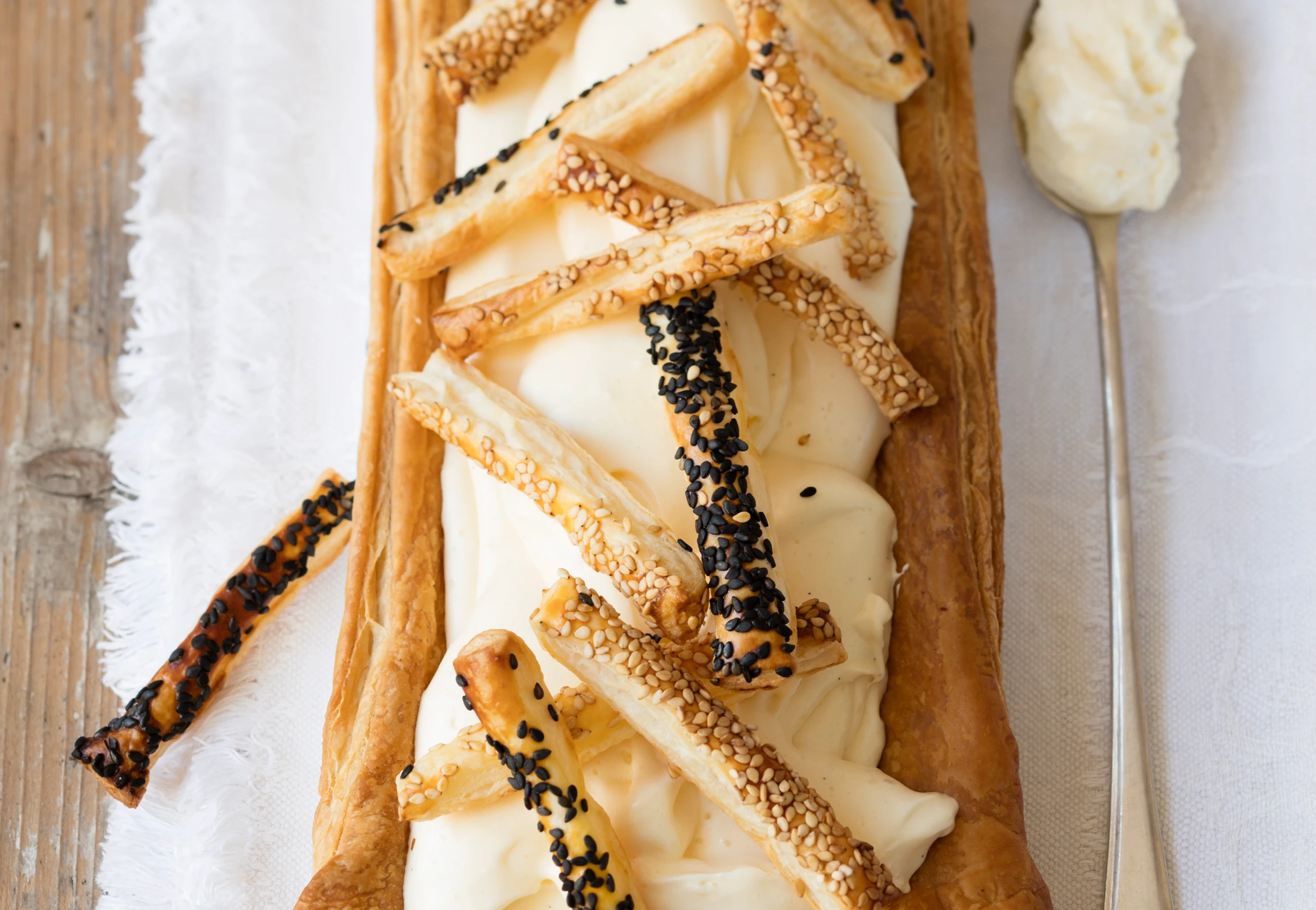 - Tarte für ca. 15 Minuten kühl stellen. Tarte mit den Sesamstreifen belegen und servieren.