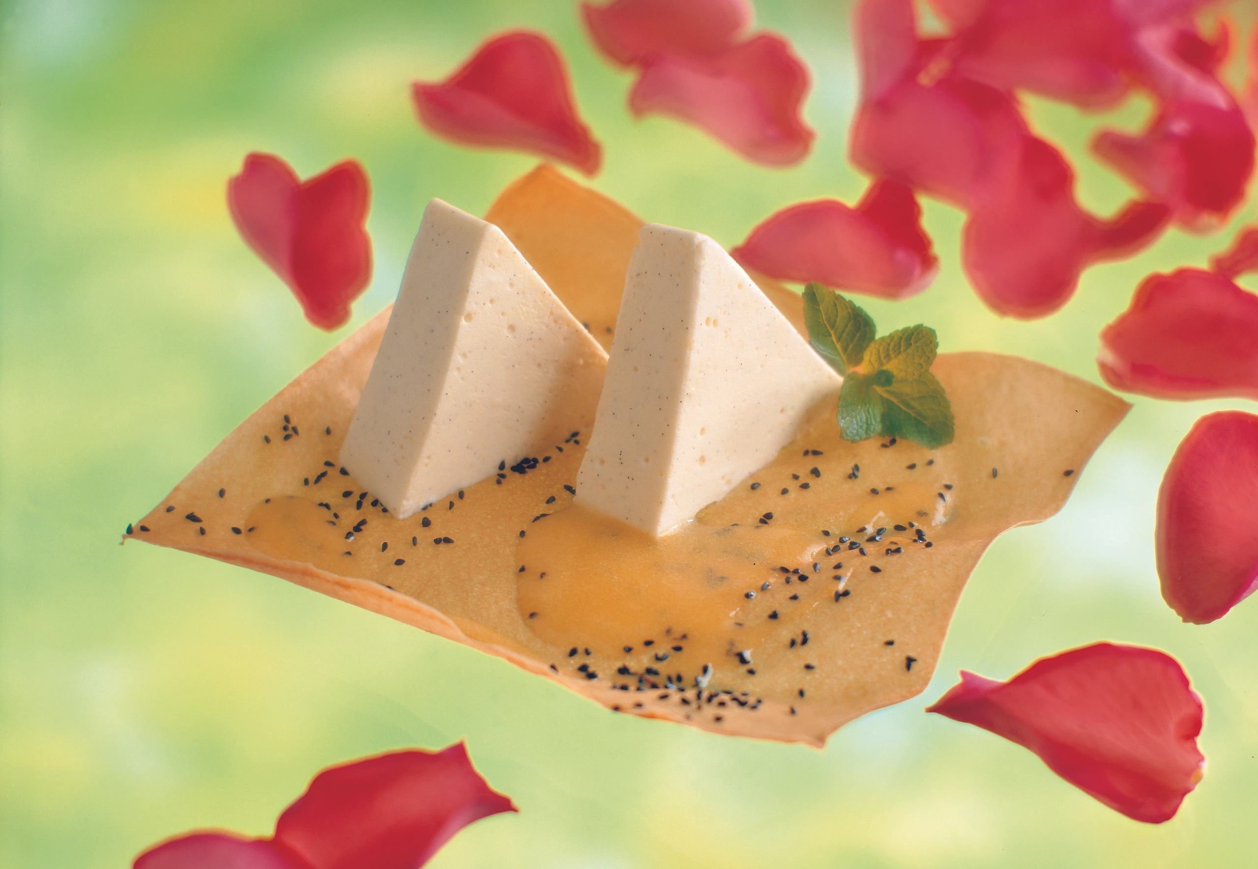 Terrine aus der Form stürzen. Folie abziehen. Terrine in Scheiben schneiden, mit Reisblättern und Pfirsichsauce (siehe Rezepte) anrichten und mit Minzeblättchen garnieren.