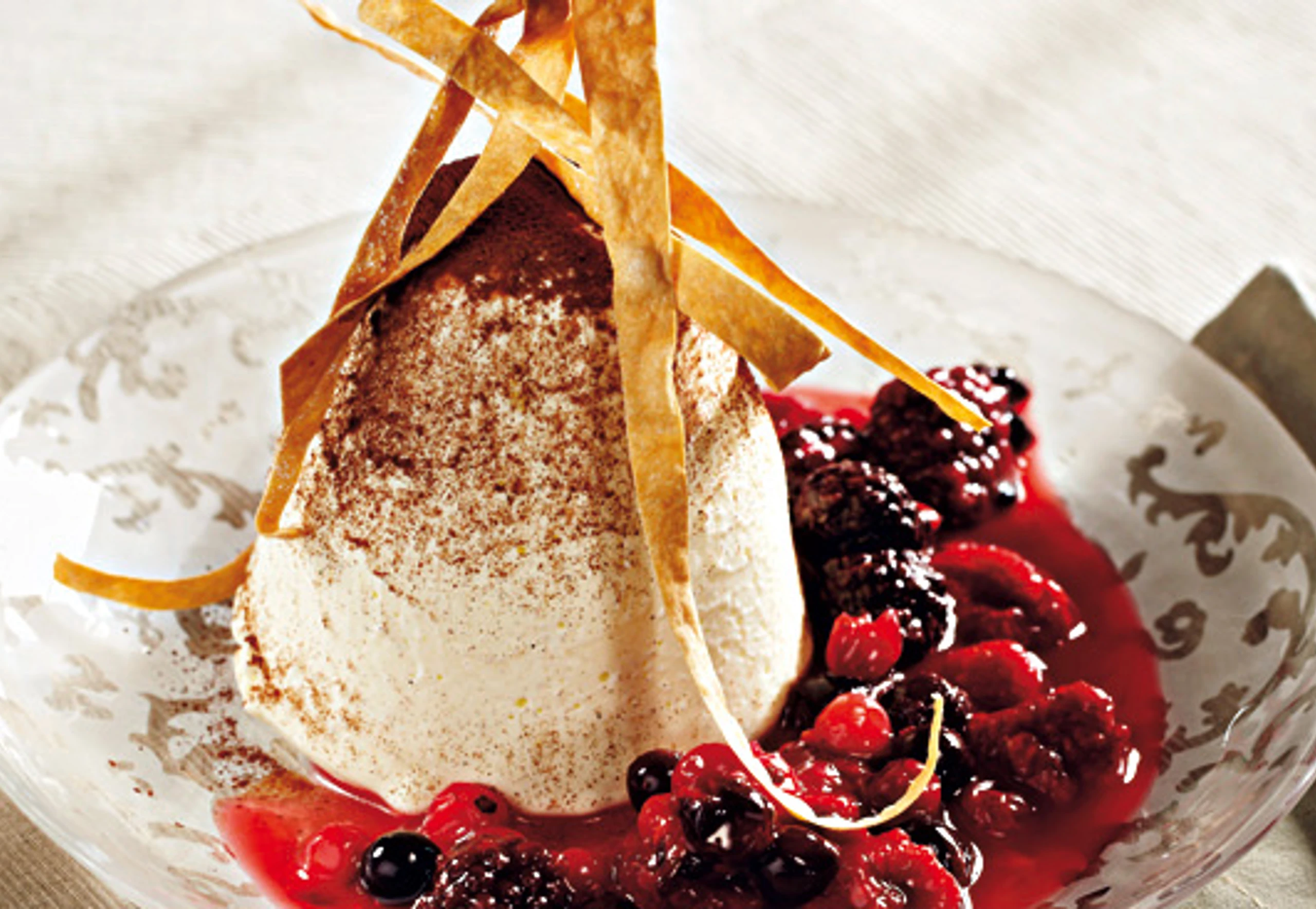 Mousse auf Teller stürzen, mit Beeren und Strudelteigstreifen garniert servieren.