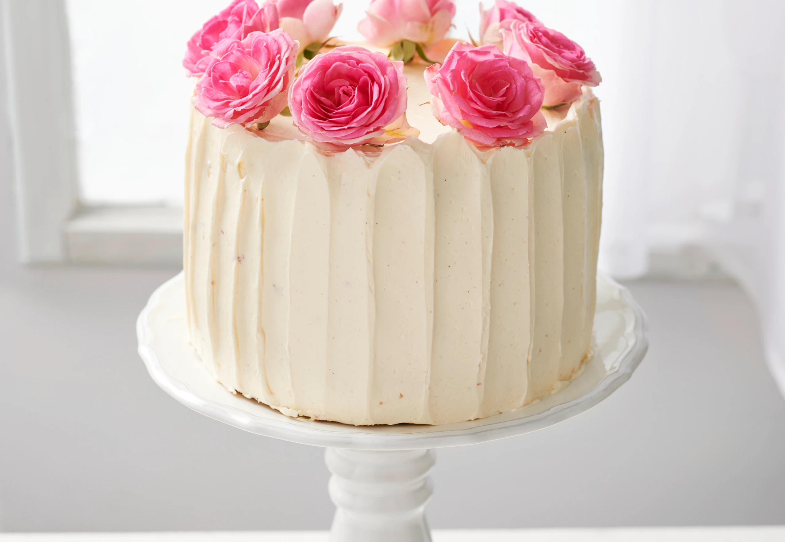 Böden herausnehmen, übereinanderstapeln, den vierten Boden darauf setzen und leicht andrücken. Torte mit der übrigen Creme rundum einstreichen. Für das Muster einen kleinen Löffel von unten nach oben ziehen. Torte über Nacht kalt stellen. Vor dem Servieren mit Rosenblüten verzieren.