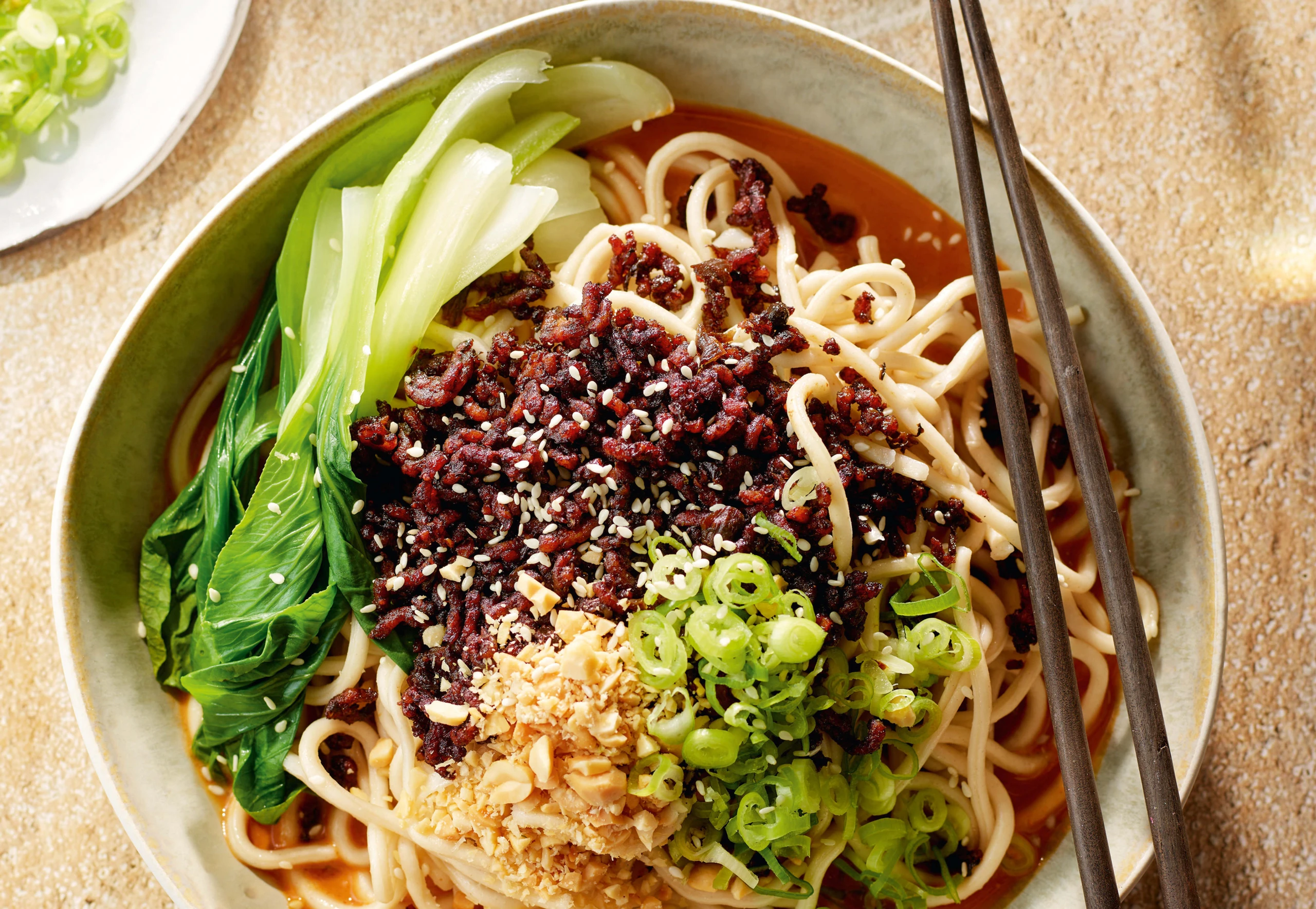 Schalen oder tiefe Teller bereitstellen. Sauce in den Schalen verteilen. Nudeln daraufgeben, mit Pak Choi, Faschiertem, Erdnüssen, Sesam und Jungzwiebeln anrichten.