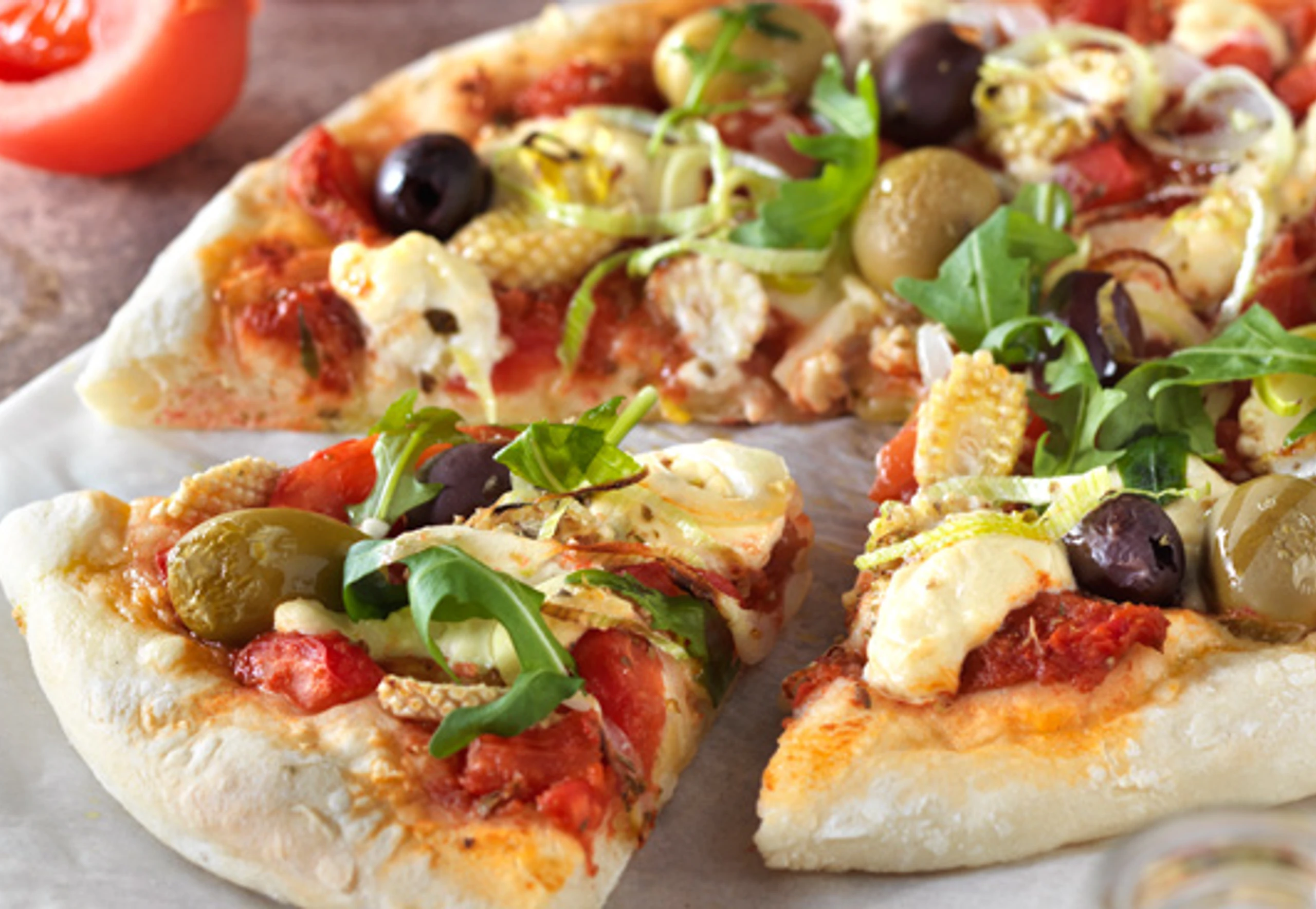 Rohr auf 230°C vorheizen. Teig vierteln, durchkneten, zu Kugeln formen und auf je einem Blatt Backpapier rund ausrollen; Rand etwas dicker lassen. Pizzen mit der Sauce bestreichen, Käseersatz darauf verteilen, mit Zwiebel, Lauch, Mais und Oliven belegen, mit wenig Olivenöl beträufeln, mit Oregano bestreuen. Pizzen auf Bleche legen, nacheinander im Rohr (mittlere Schiene) ca. 12 Minuten backen. Pizzen mit Rucola bestreut servieren.