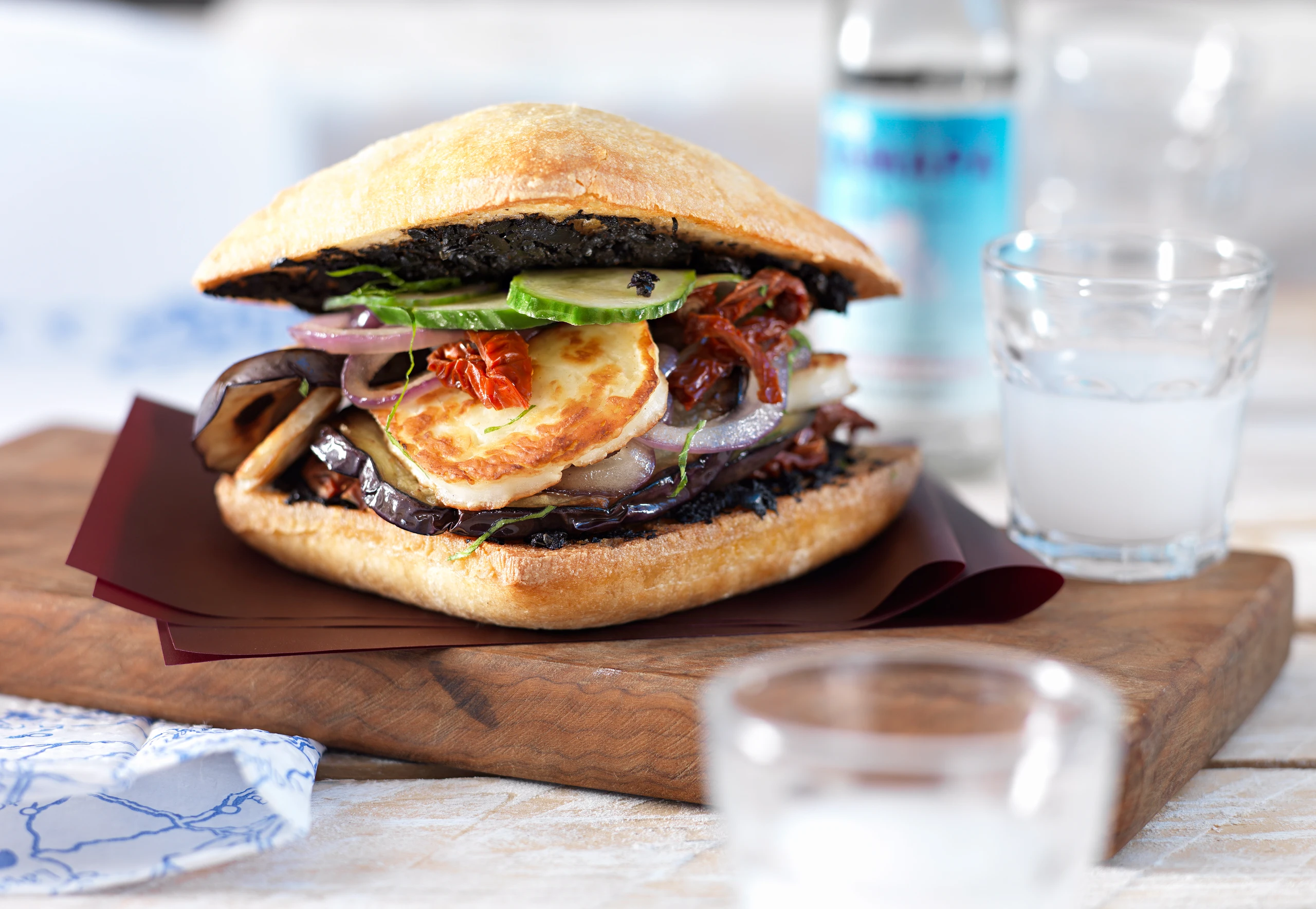 Ciabattaweckerl aufschneiden, mit der Olivenpaste bestreichen, mit Melanzani, Zwiebel, Halloumi, Paradeiser und Gurken füllen.