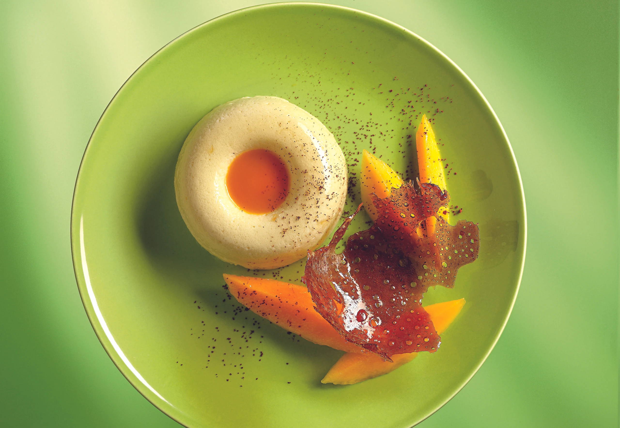 Förmchen kurz in heißes Wasser tauchen, Savarins auf Teller stürzen. Mangopüree in die Ringöffnung füllen. Savarins mit Mangoscheiben und Zuckerl-Blättern garniert servieren.