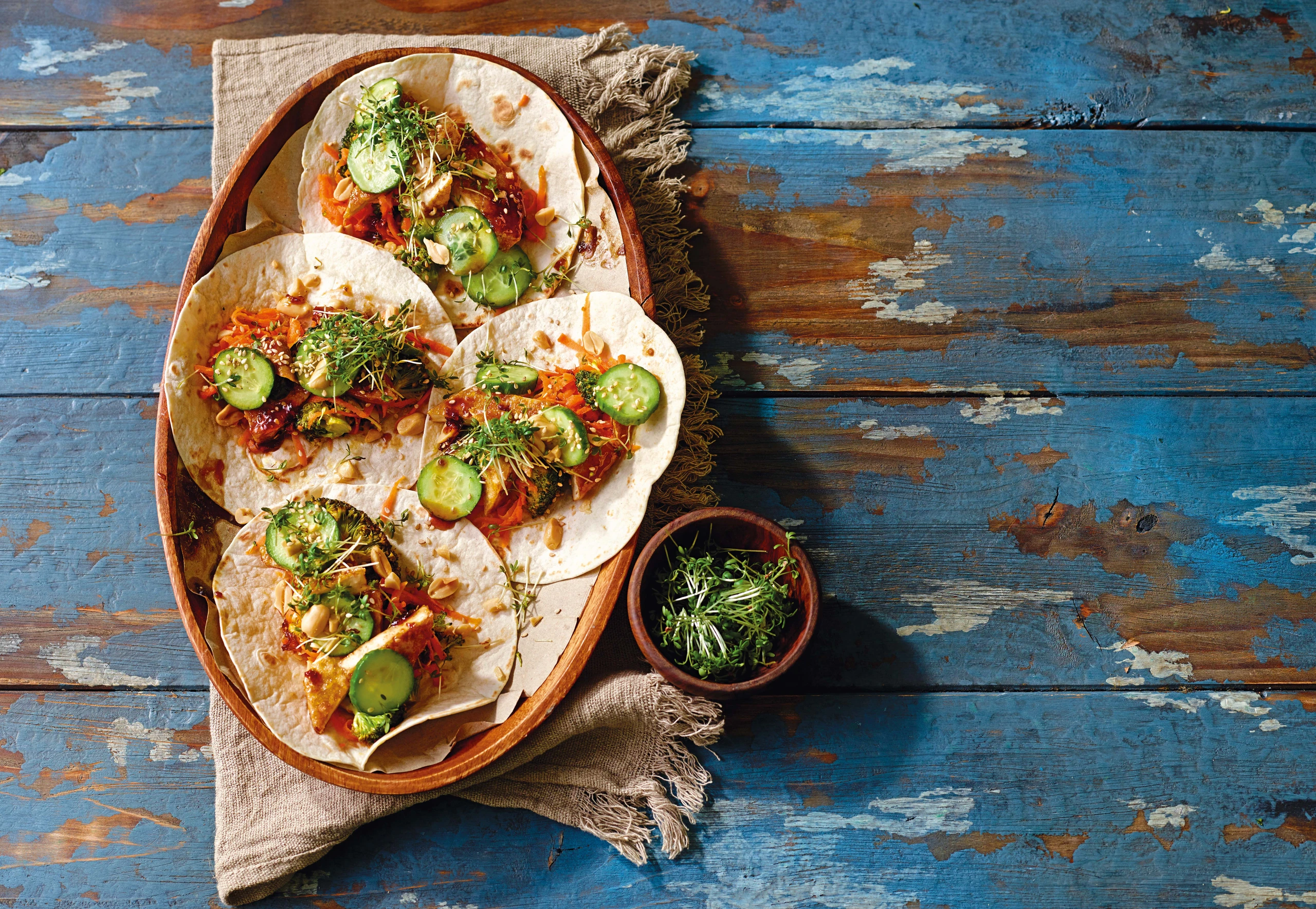 Tortillas laut Anweisung auf der Packung erwärmen. Gemüse erwärmen. Tortillas mit Gemüse, Gurken und Tofu belegen, mit Sauce beträufeln und mit Nüssen, Kresse und Sesam bestreuen.