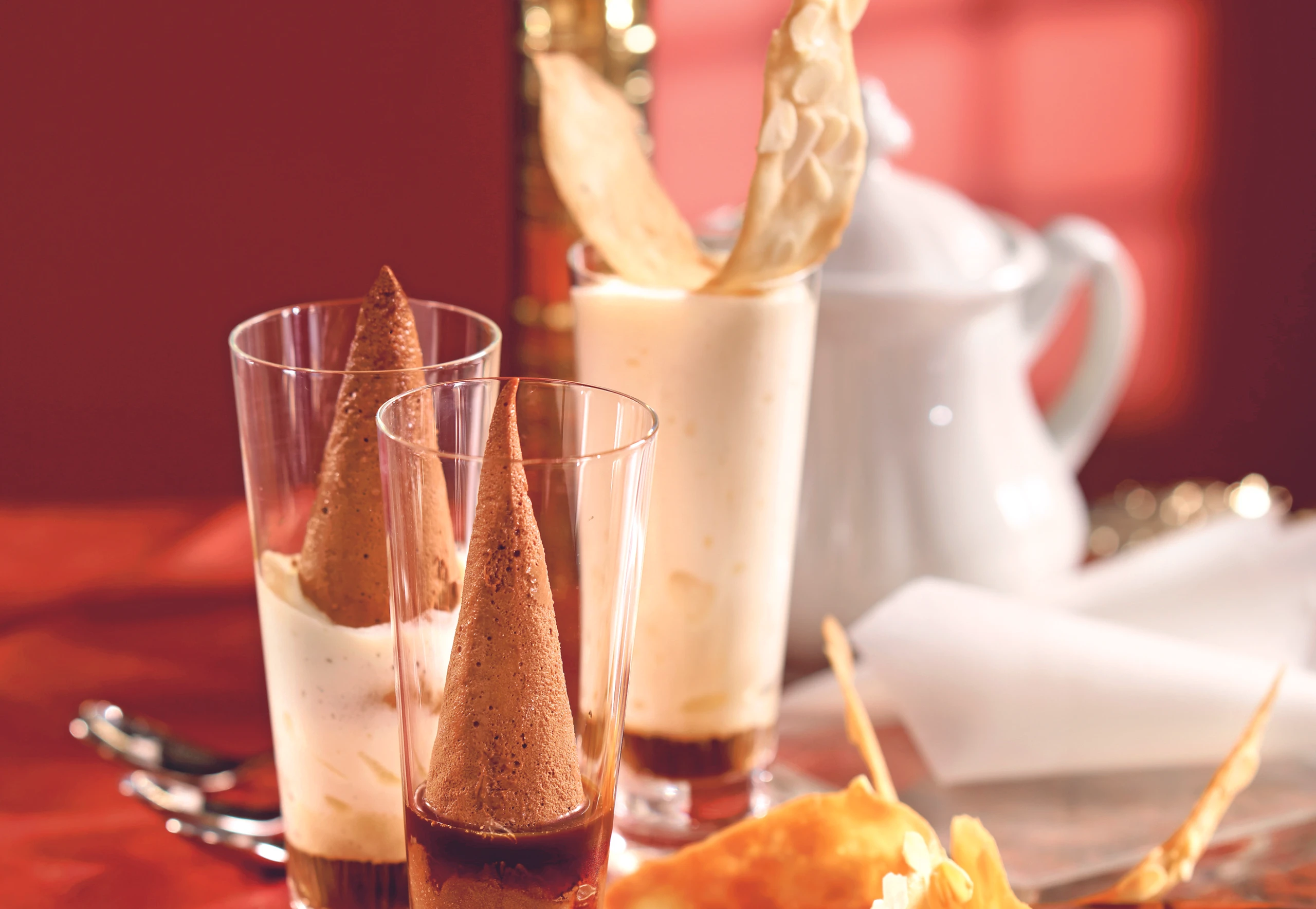 - Je einen Parfaitspitz in ein Glas stellen (Papier entfernen), Likör oder Espresso zugießen, mit Vanilleschaum auffüllen. Eiskaffee mit Mandelbögen dekorieren.