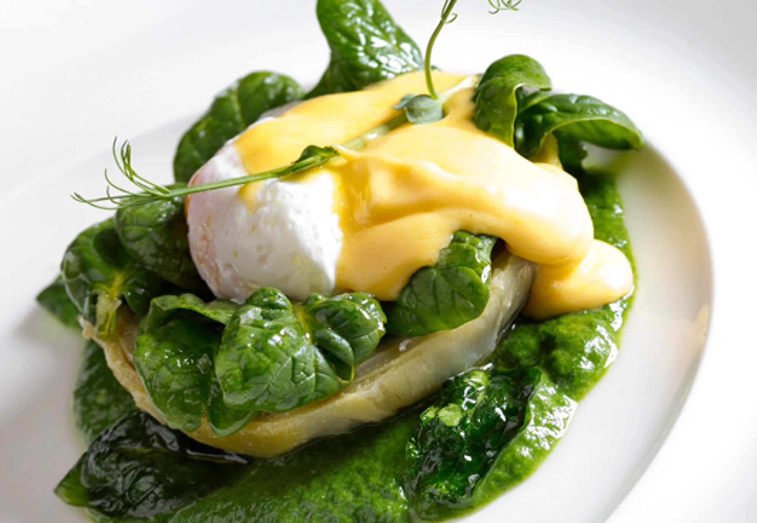 Cremespinat anrichten, Artischockenböden daraufsetzen und mit Blattspinat füllen. Eier aus dem Wasser heben, auf den Spinat setzen und mit Hollandaise übergießen. Eventuell mit Erbsenkraut und gebackenen Spinatblättern garnieren.