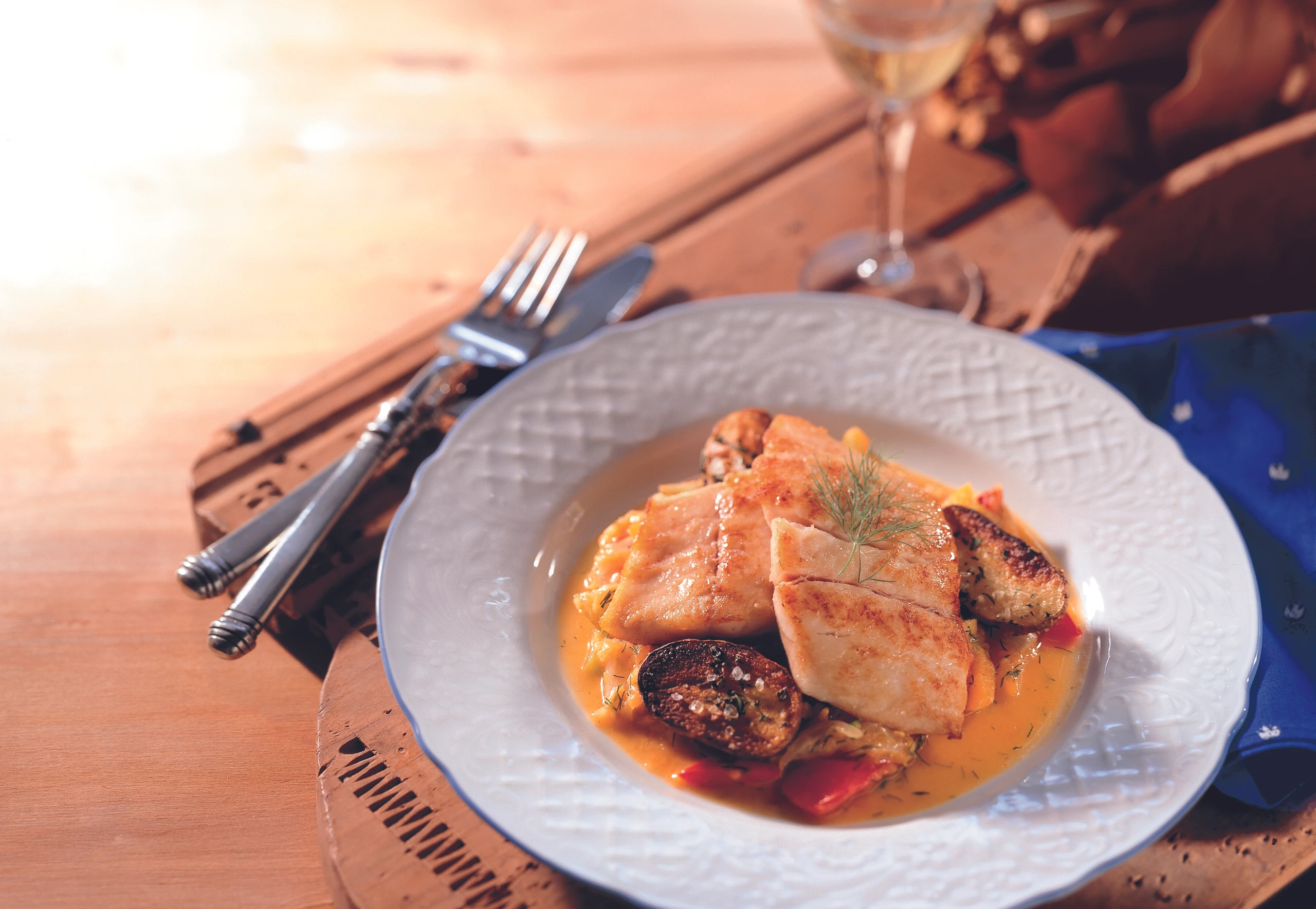 Victoria-Barschfilet mit Kürbiskraut und gebackenen Erdäpfeln