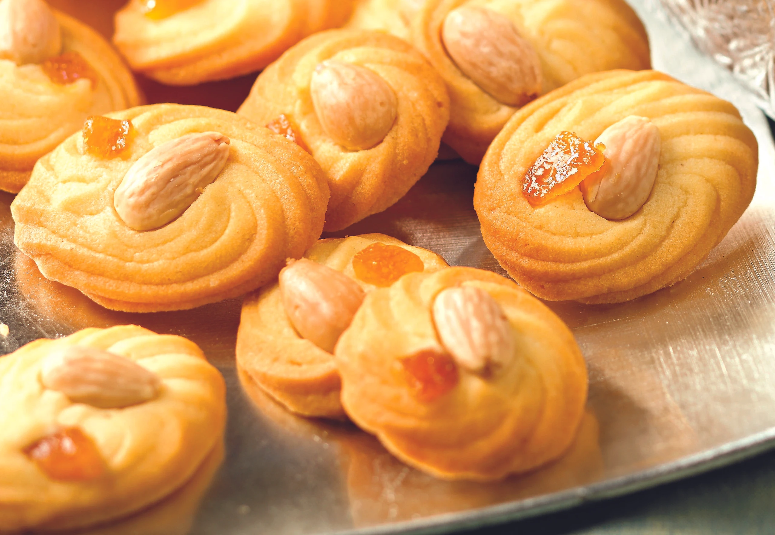 Rohr auf 180°C vorheizen. Masse in einen Dressiersack mit Sterntülle füllen und runde oder ovale Formen auf ein mit Backpapier belegtes Backblech bzw. auf eine Silikon-Backmatte dressieren. Mit Mandeln und Orangenwürfeln dekorieren.