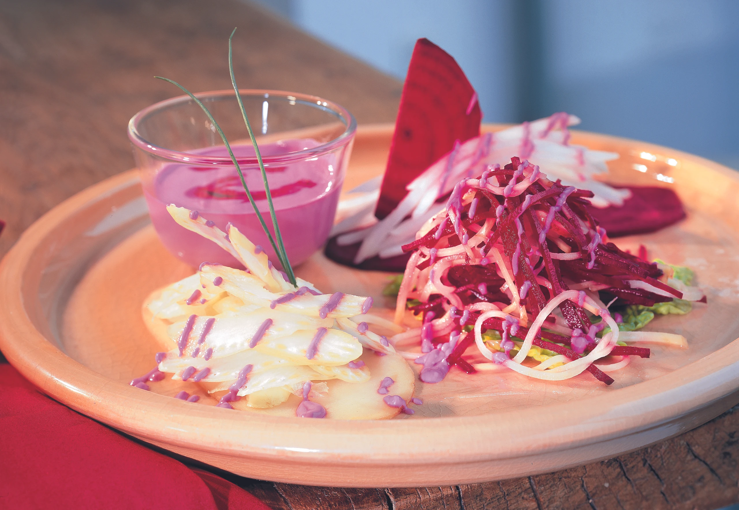 Gemüse vermischen, mit der Sauce anrichten und mit Stangensellerie, dünnen Scheiben von Roten Rüben und Erdäpfeln garnieren.