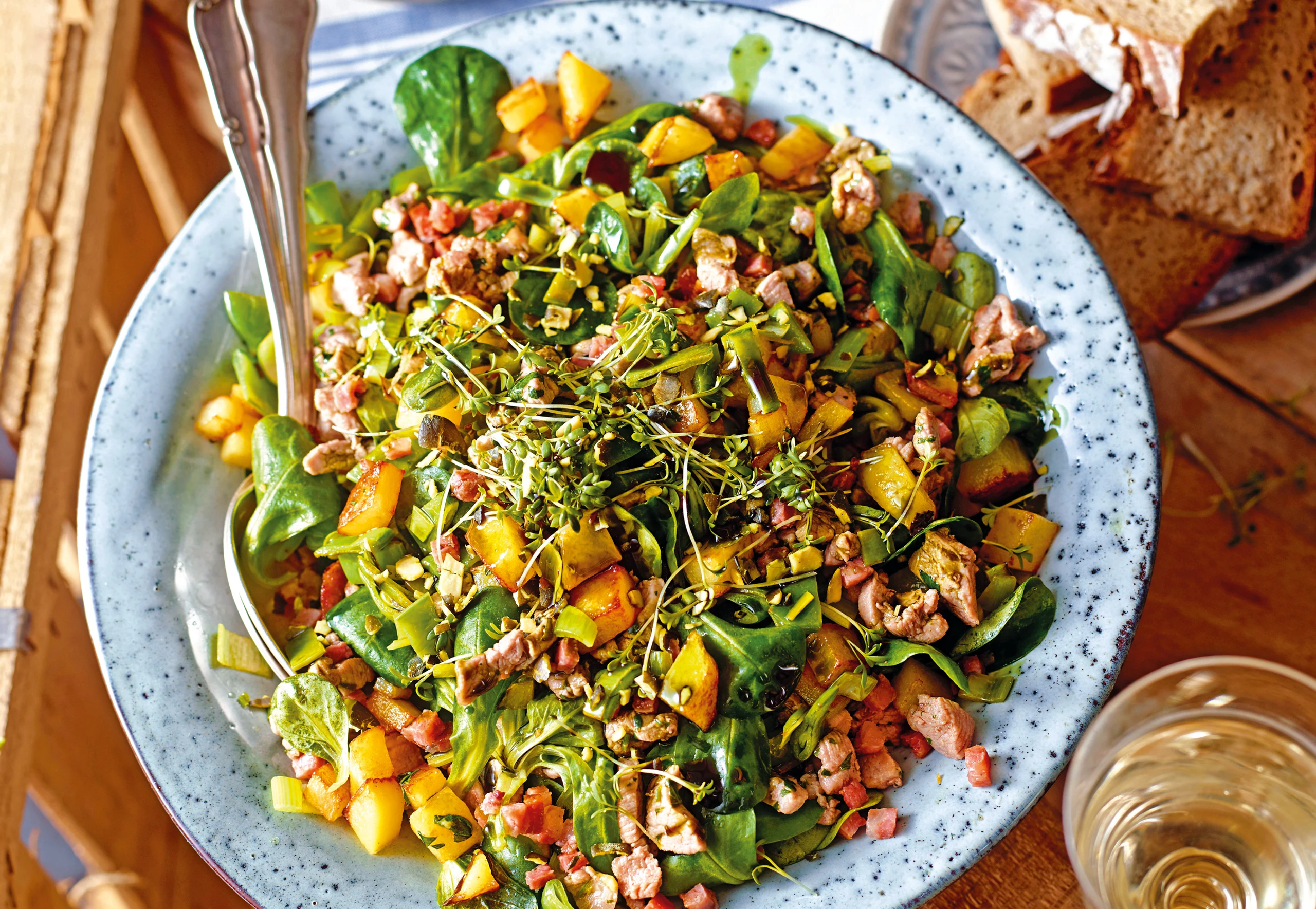 Schweinsfilet längs in Streifen schneiden, dann quer in möglichst kleine Stücke schneiden. Speck würfeln. Lauch putzen, längs halbieren und klein schneiden. Schoten putzen und in ca. 1 cm große Stücke schneiden. Erdäpfel schälen und in ca. 1 cm große Würfel schneiden. Vogerlsalat putzen und grobe Stiele entfernen. Kresse von den Stielen schneiden.